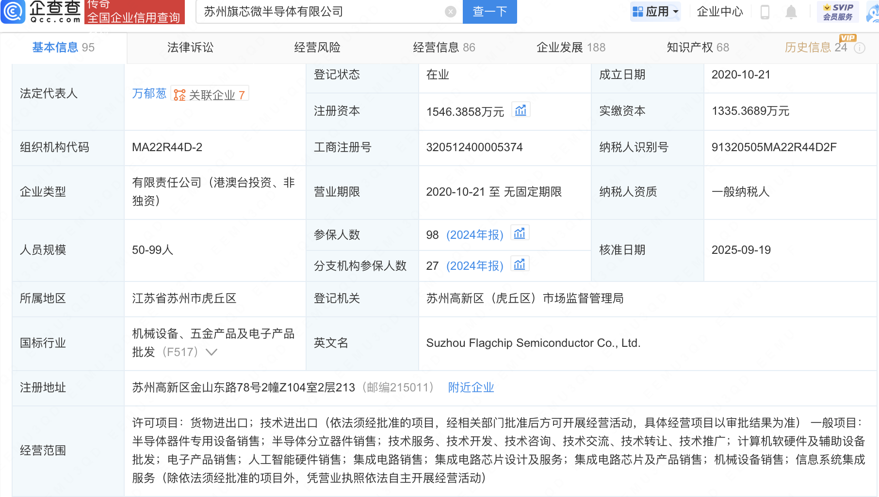 企查查APP显示,近日,苏州旗芯微半导体有限公司发生工商变更,新增北京小米智造股权投资基金合伙企业(有限合伙)等为股东,同时注册资本增至1546.39万元。企查查信息显示,该公司成立于2020年,经营范围包含:半导体器件专用设备销售;半导体分立器件销售;人工智能硬件销售;集成电路销售等。据其官网,该公司从事汽车高端控制器芯片的研发和销售。
