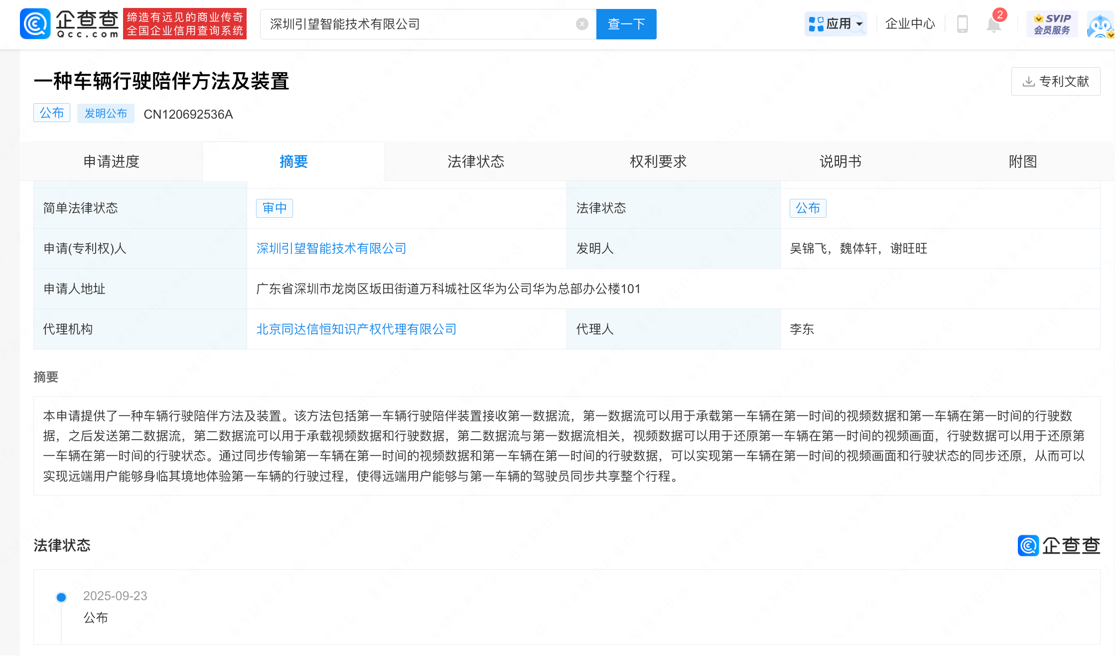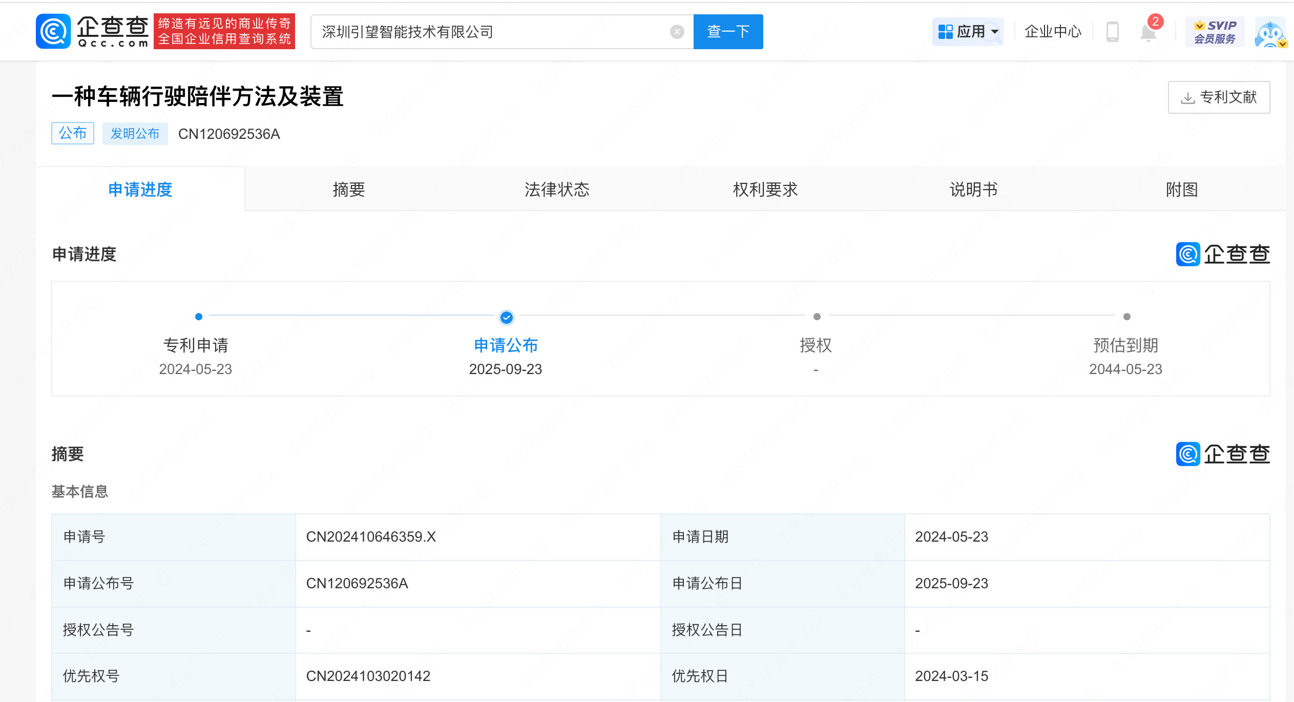 企查查APP显示,近日,深圳引望智能技术有限公司申请的“一种车辆行驶陪伴方法及装置”专利公布。