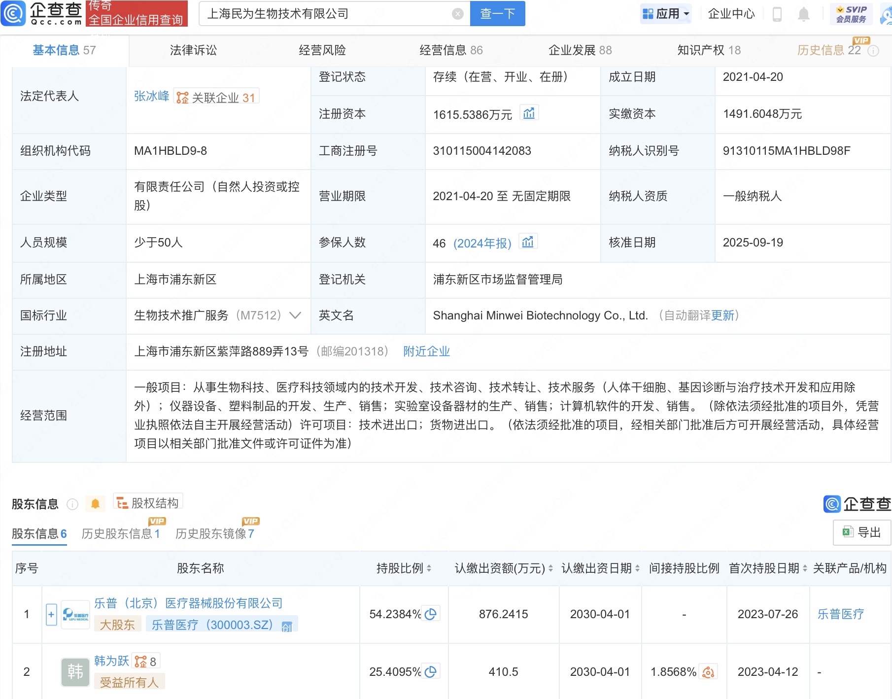 企查查APP显示,近日,上海民为生物技术有限公司发生工商变更,新增广西腾讯创业投资有限公司为股东,同时注册资本增至约1616万人民币。企查查信息显示,该公司成立于2021年,法定代表人为张冰峰,经营范围包括从事生物科技、医疗科技领域内的技术开发等,其大股东为乐普医疗(300003)。公开信息显示,该公司专注于前沿“多核心大分子生物药”创新以及平台开发,打造具有全球竞争力的创新药。