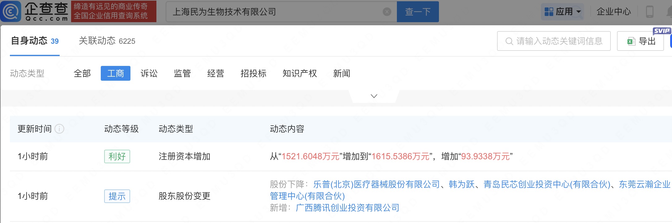 企查查APP显示,近日,上海民为生物技术有限公司发生工商变更,新增广西腾讯创业投资有限公司为股东,同时注册资本增至约1616万人民币。企查查信息显示,该公司成立于2021年,法定代表人为张冰峰,经营范围包括从事生物科技、医疗科技领域内的技术开发等,其大股东为乐普医疗(300003)。公开信息显示,该公司专注于前沿“多核心大分子生物药”创新以及平台开发,打造具有全球竞争力的创新药。