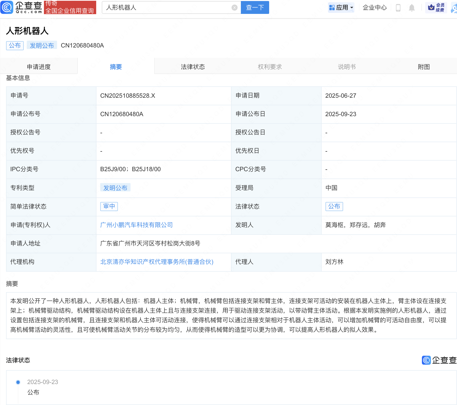 企查查APP显示,近日,广州小鹏汽车科技有限公司“人形机器人”专利公布。企查查专利摘要显示,人形机器人包括:机器人主体;机械臂,机械臂包括连接支架和臂主体,连接支架可活动的安装在机器人主体上,臂主体设在连接支架上;机械臂驱动结构,机械臂驱动结构设在机器人主体上且与连接支架连接,用于驱动连接支架活动,以带动臂主体活动。