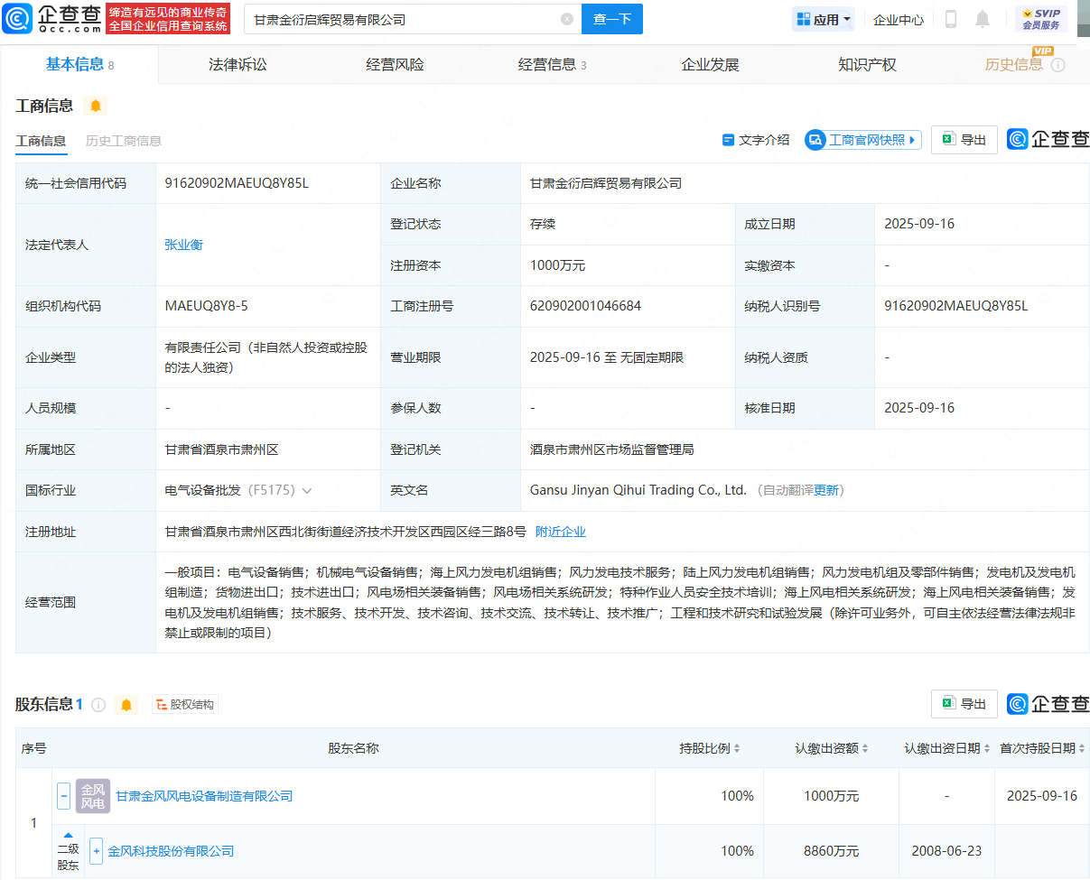 企查查APP显示,近日,甘肃金衍启辉贸易有限公司成立,法定代表人为张业衡,注册资本为1000万元,经营范围包含:海上风力发电机组销售;风力发电技术服务;陆上风力发电机组销售;风力发电机组及零部件销售等。企查查股权穿透显示,该公司由金风科技(002202)间接全资持股。