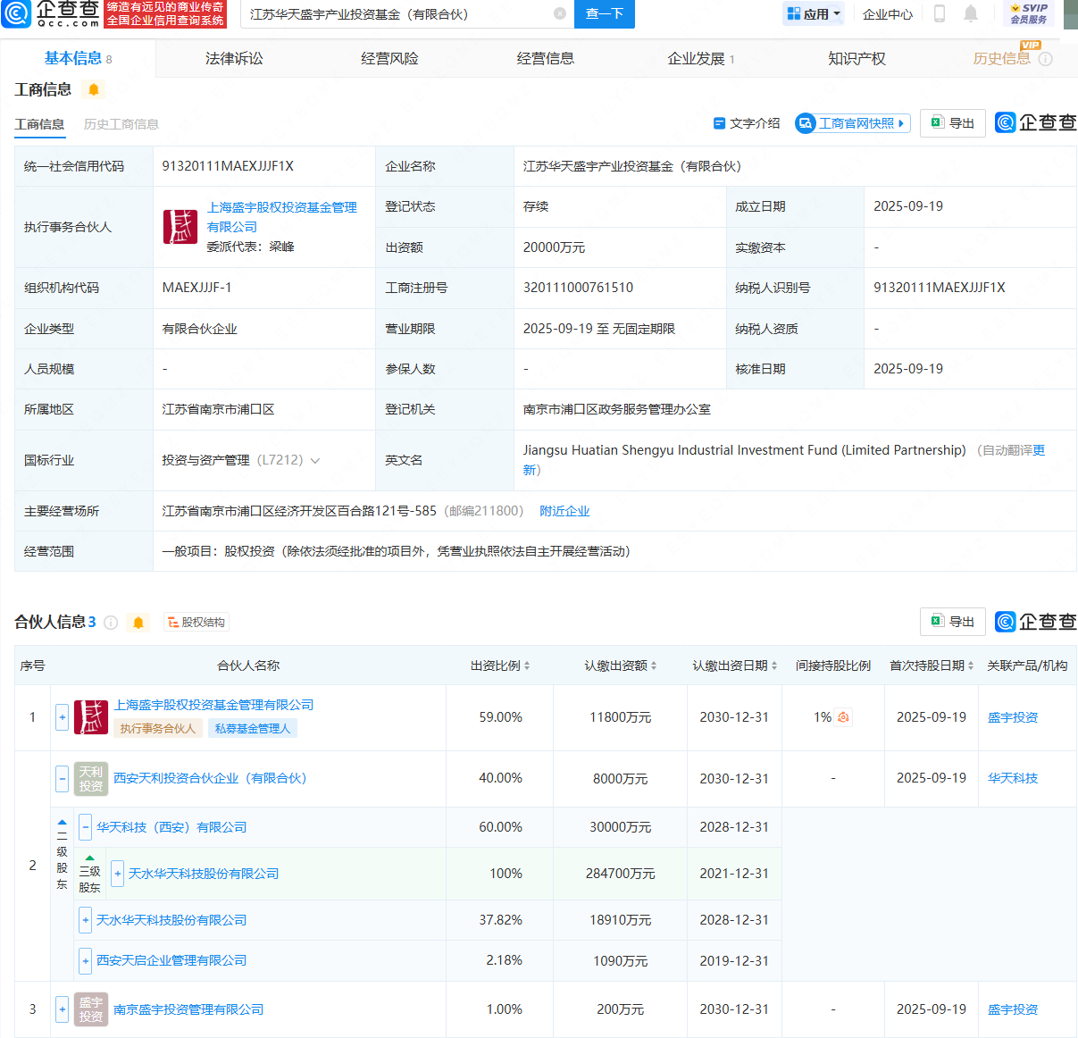 企查查APP显示,近日,江苏华天盛宇产业投资基金(有限合伙)成立,出资额2亿元,经营范围包含:股权投资。企查查股权穿透显示,该公司由上海盛宇股权投资基金管理有限公司、华天科技(002185)旗下西安天利投资合伙企业(有限合伙)等共同持股。
