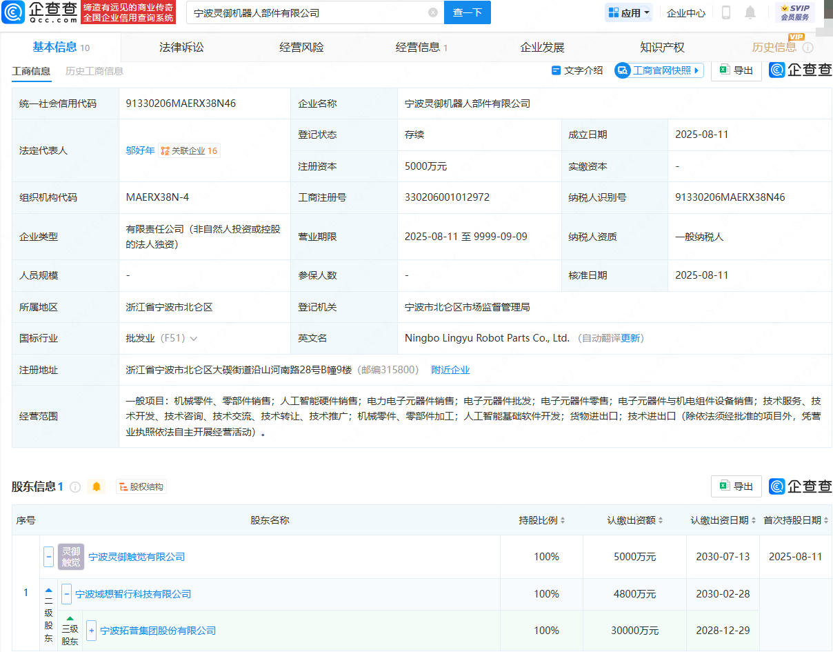 企查查APP显示,近日,宁波灵御机器人部件有限公司成立,法定代表人为邬好年,注册资本为5000万元,经营范围包含:人工智能硬件销售;电力电子元器件销售;电子元器件批发;电子元器件零售等。企查查股权穿透显示,该公司由拓普集团(601689)间接全资持股。