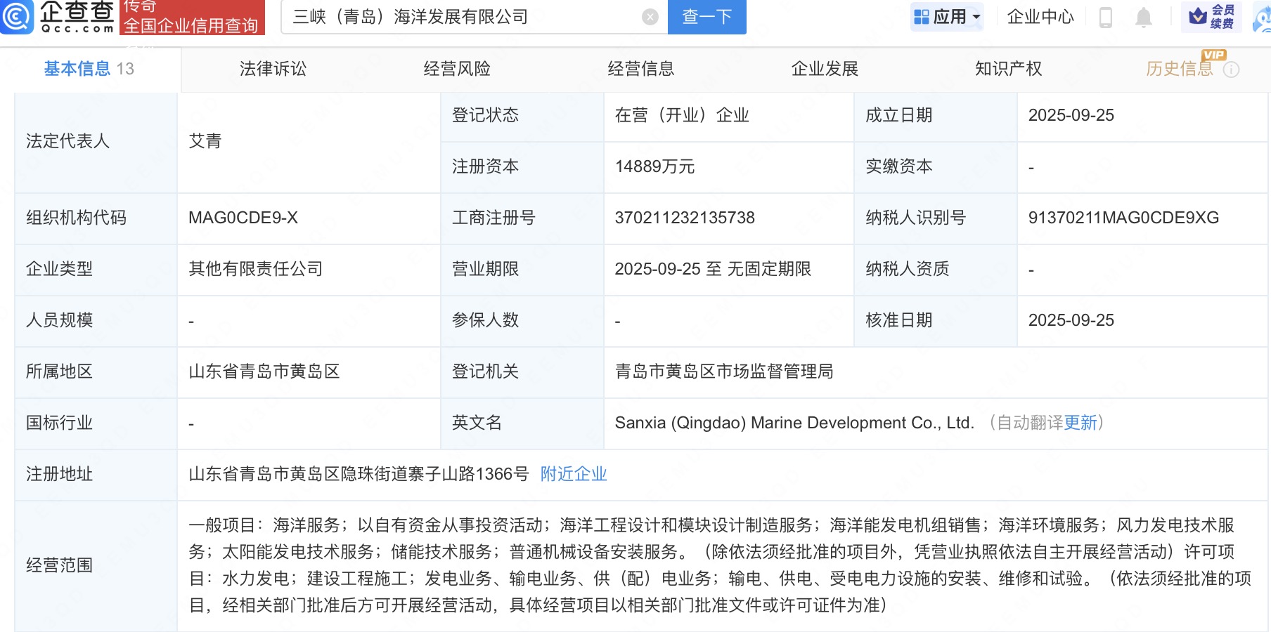 企查查APP显示,近日,三峡(青岛)海洋发展有限公司成立,法定代表人为艾青,注册资本约1.49亿人民币,经营范围包括海洋服务、以自有资金从事投资活动、海洋工程设计和模块设计制造服务等。企查查股权穿透显示,该公司由三峡能源(600905)、长江三峡投资管理有限公司、汉缆股份(002498)、盘古智能(301456)等共同持股。