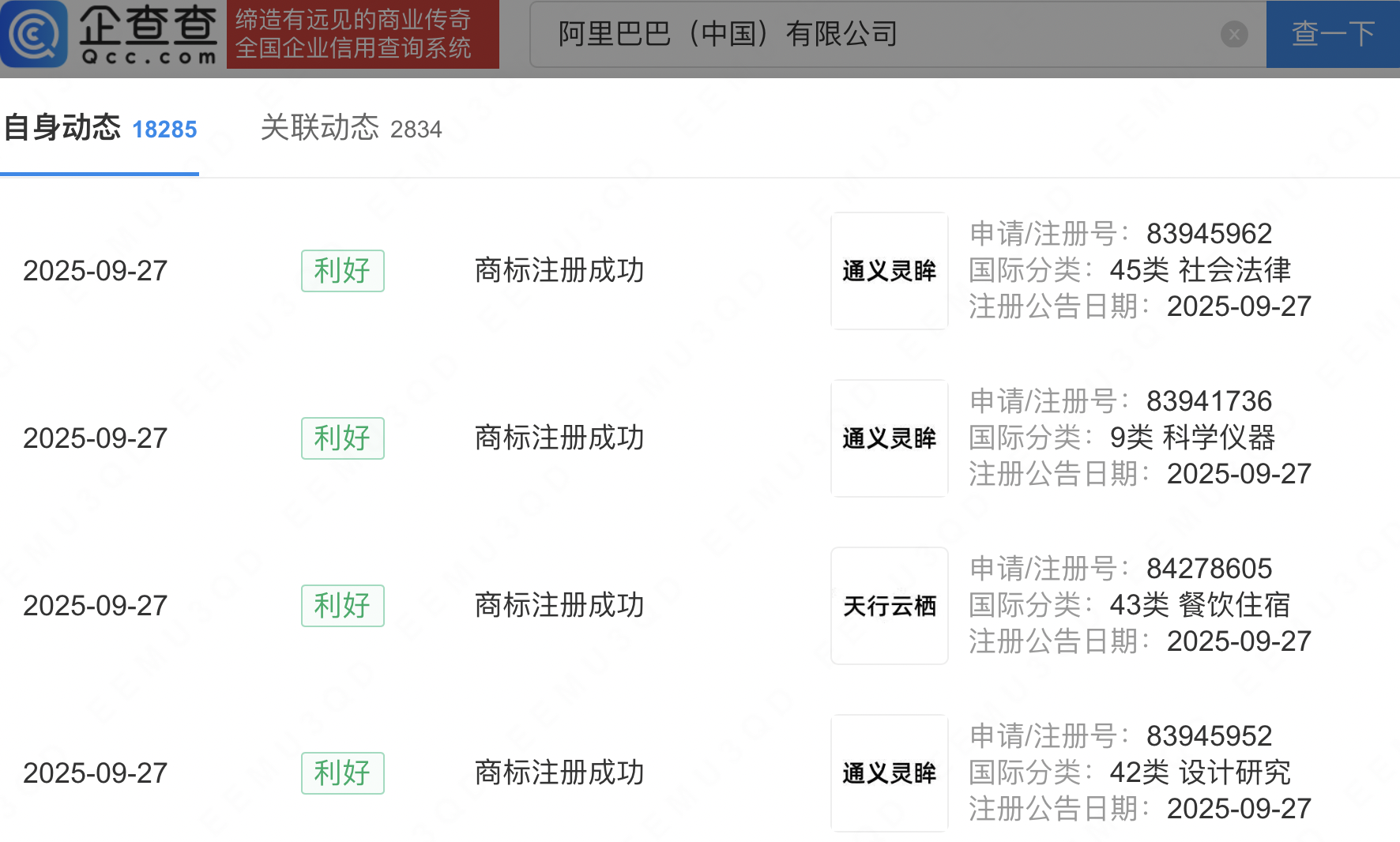 企查查APP显示,近日,阿里巴巴(中国)有限公司多枚“通义灵眸”商标注册成功,国际分类涉及社会法律、科学仪器等。公开信息显示,通义灵眸是阿里巴巴旗下通义大模型推出的数字人生成与应用平台,提供从定制开发到多场景部署的一站式解决方案。