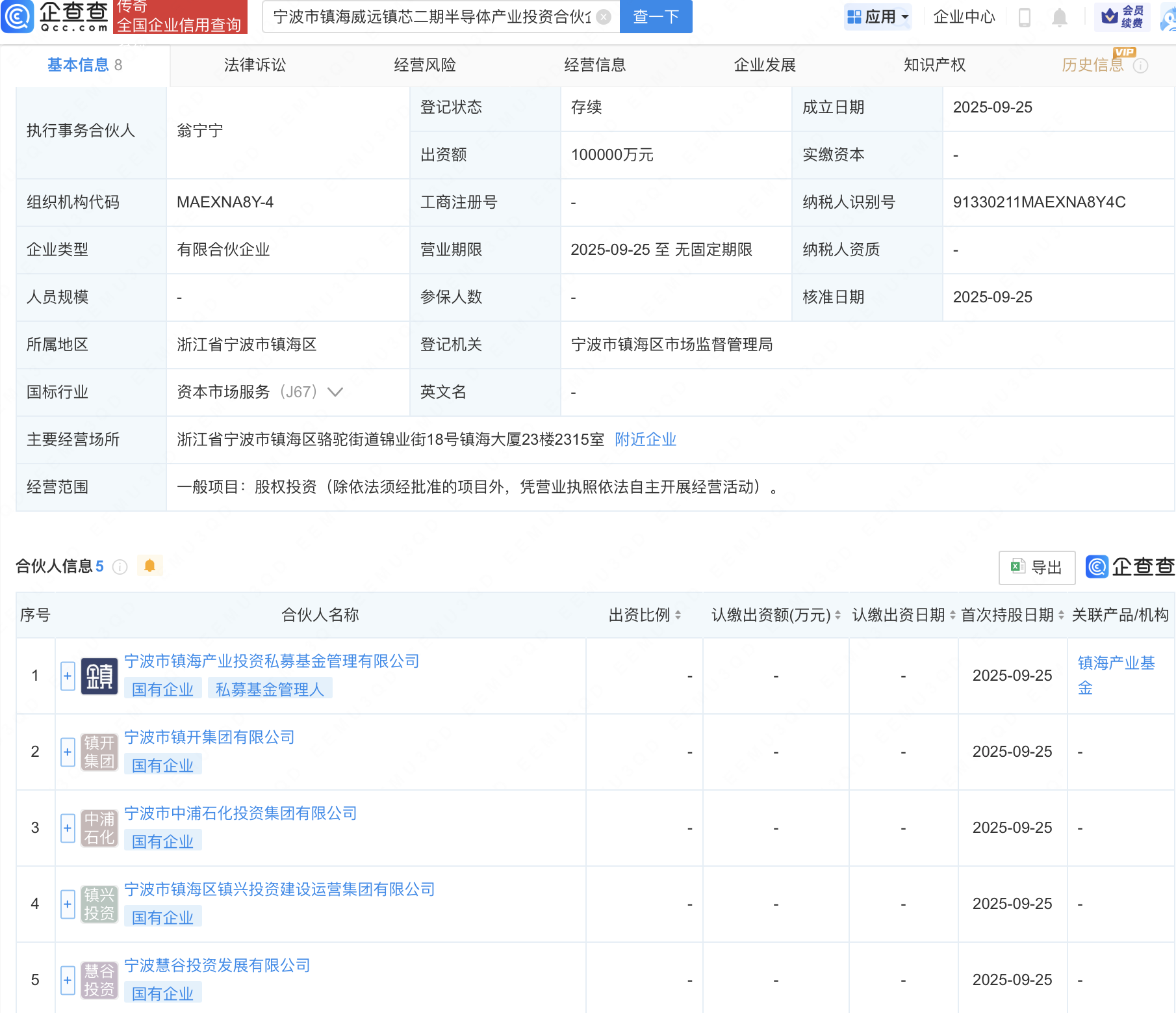 镇海产业基金等新设半导体产投合伙企业,出资额10亿