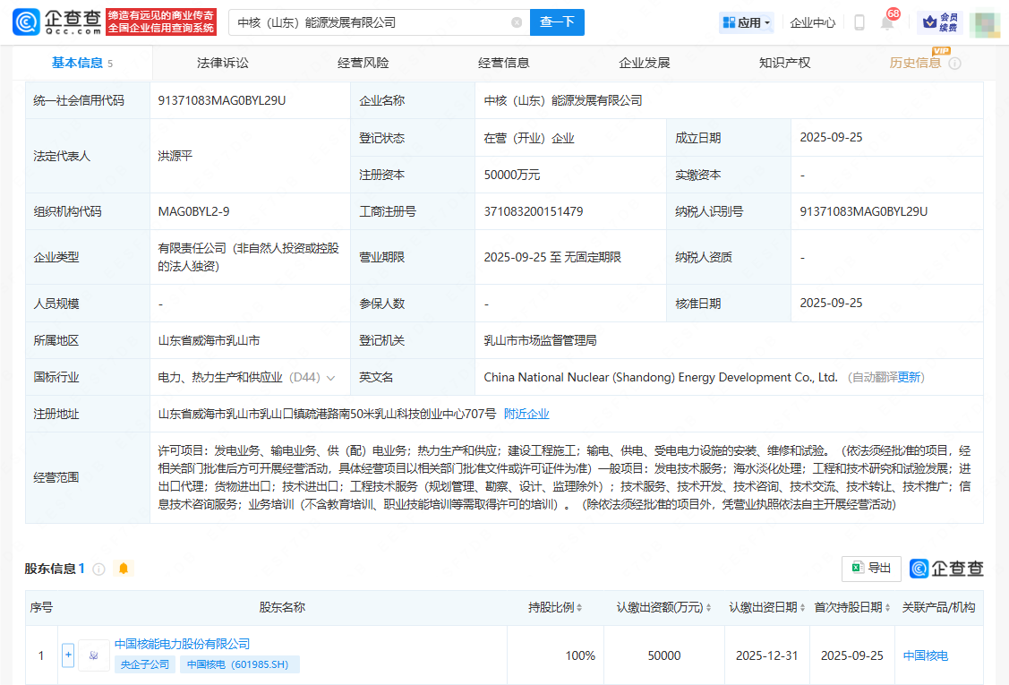 企查查APP显示,近日,中核(山东)能源发展有限公司成立,法定代表人为洪源平,注册资本5亿元人民币,经营范围包括发电技术服务、海水淡化处理、工程和技术研究和试验发展、进出口代理等。企查查股权穿透显示,该公司由中国核电(601985)全资持股。