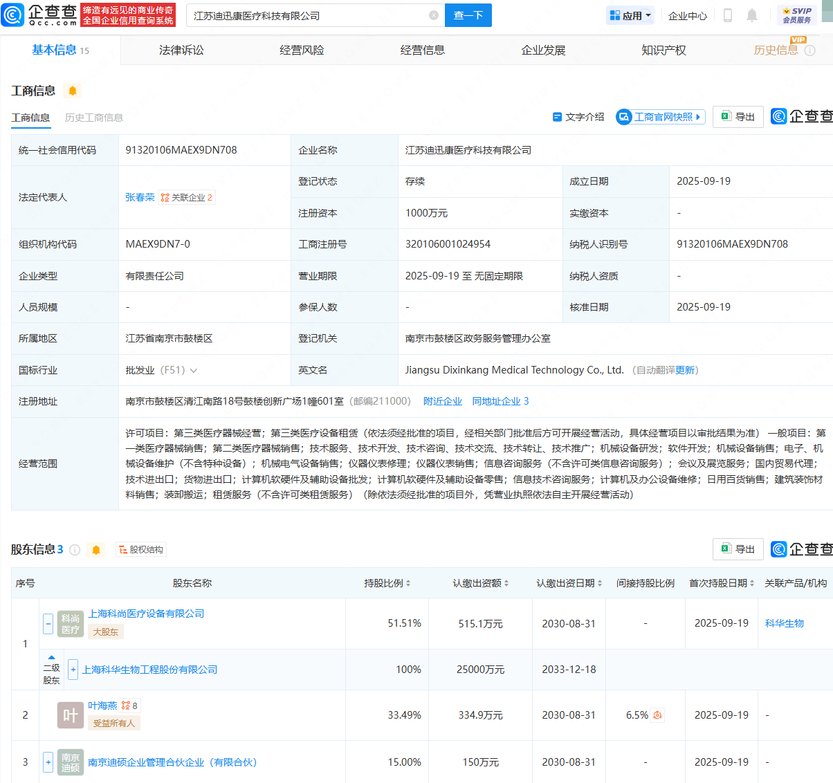 企查查APP显示,近日,江苏迪迅康医疗科技有限公司成立,法定代表人为张春荣,注册资本为1000万元,经营范围包含:第三类医疗器械经营;软件开发;机械设备销售;机械电气设备销售;仪器仪表修理等。企查查股权穿透显示,该公司由科华生物(002022)控股公司上海科尚医疗设备有限公司等共同持股。