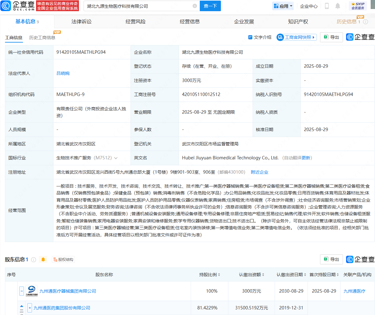 企查查APP显示,近日,湖北九源生物医疗科技有限公司成立,法定代表人为吕晓婉,注册资本为3000万元,经营范围包含:第一类医疗器械销售;保健食品(预包装)销售;通用设备修理;专用设备修理;非居住房地产租赁等。企查查股权穿透显示,该公司由九州通(600998)旗下九州通医疗器械集团有限公司全资持股。