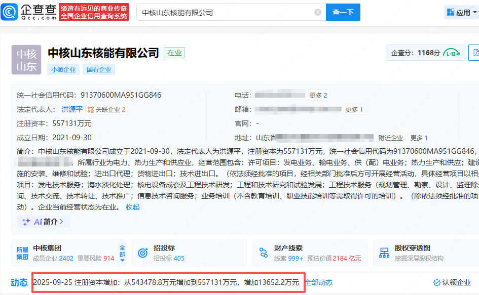 企查查APP显示,近日,中核山东核能有限公司发生工商变更,注册资本从约54.35亿元增加到55.71亿元。