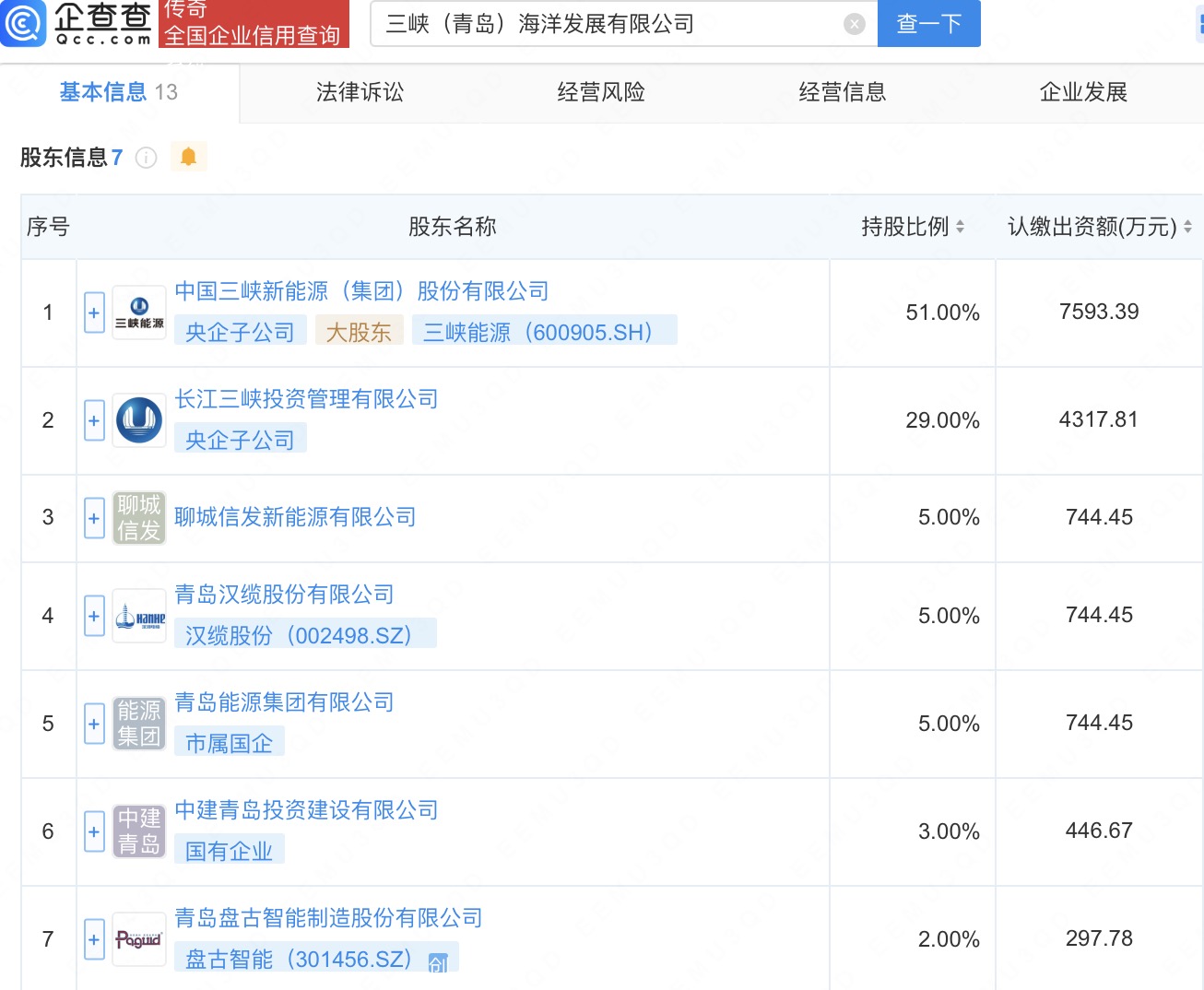 企查查APP显示,近日,三峡(青岛)海洋发展有限公司成立,法定代表人为艾青,注册资本约1.49亿人民币,经营范围包括海洋服务、以自有资金从事投资活动、海洋工程设计和模块设计制造服务等。企查查股权穿透显示,该公司由三峡能源(600905)、长江三峡投资管理有限公司、汉缆股份(002498)、盘古智能(301456)等共同持股。