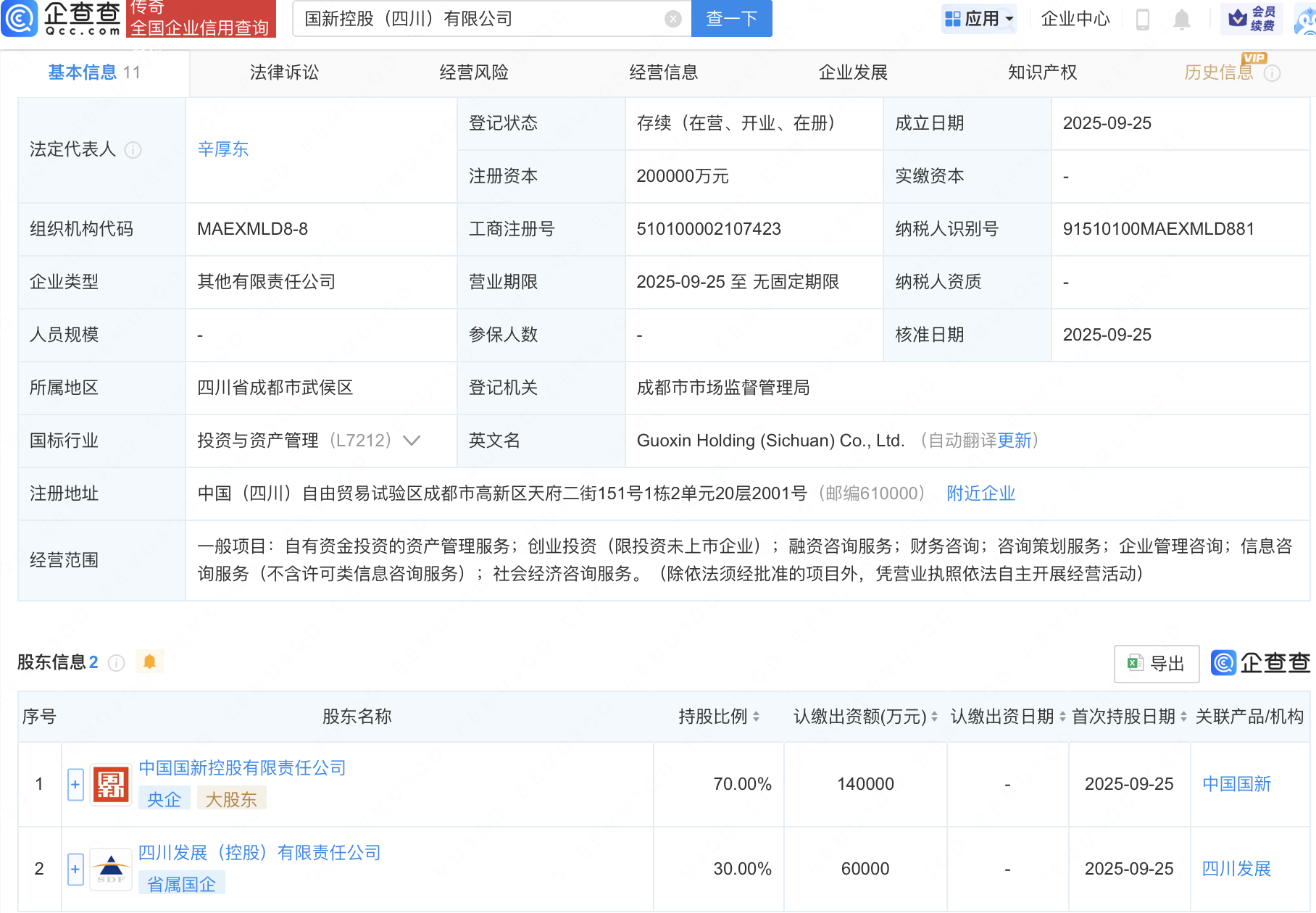 企查查APP显示,近日,国新控股(四川)有限公司成立,注册资本20亿元,经营范围包含:自有资金投资的资产管理服务;创业投资(限投资未上市企业);融资咨询服务等。企查查股权穿透显示,该公司由中国国新控股有限责任公司、四川发展(控股)有限责任公司共同持股。