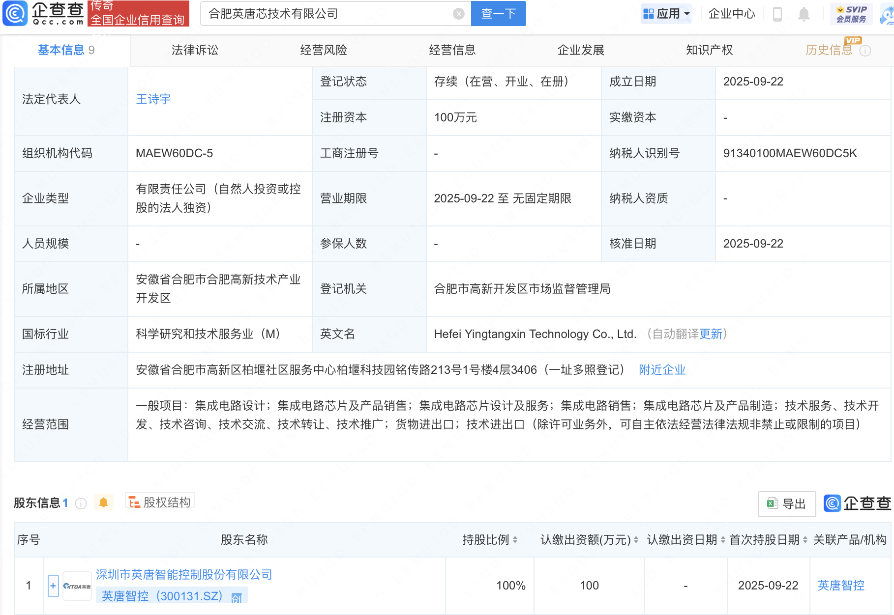 企查查APP显示,近日,合肥英唐芯技术有限公司成立,法定代表人为王诗宇,经营范围包含:集成电路设计;集成电路芯片及产品销售;集成电路芯片设计及服务;集成电路销售;集成电路芯片及产品制造等。企查查股权穿透显示,该公司由英唐智控(300131)全资持股。