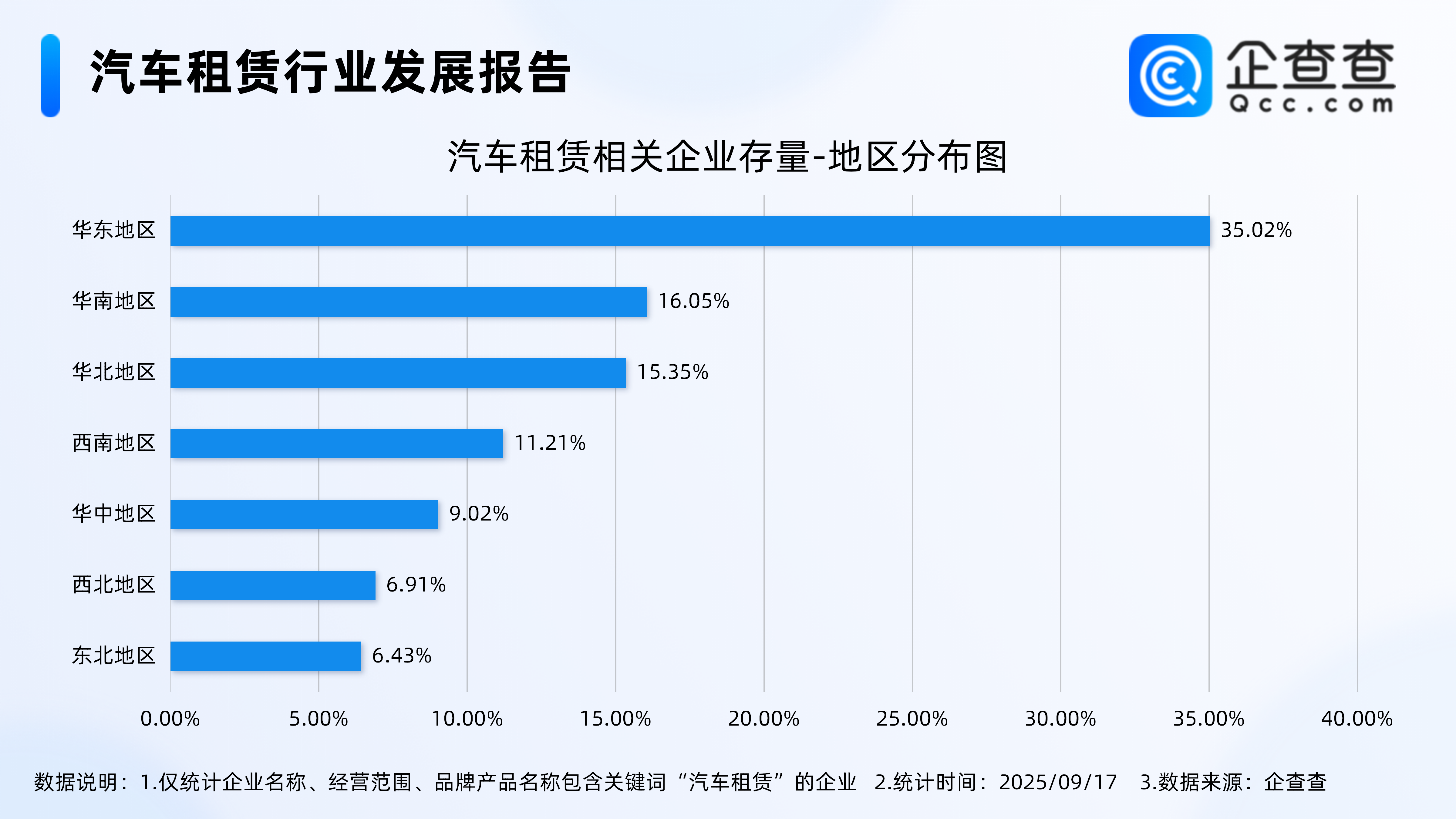 企查查数据显示,从地区分布来看,汽车租赁相关企业主要集中分布在华东地区,占比达35.02%。其次,分布在华南地区、华北地区的相关企业分别占比16.05%、15.35%。