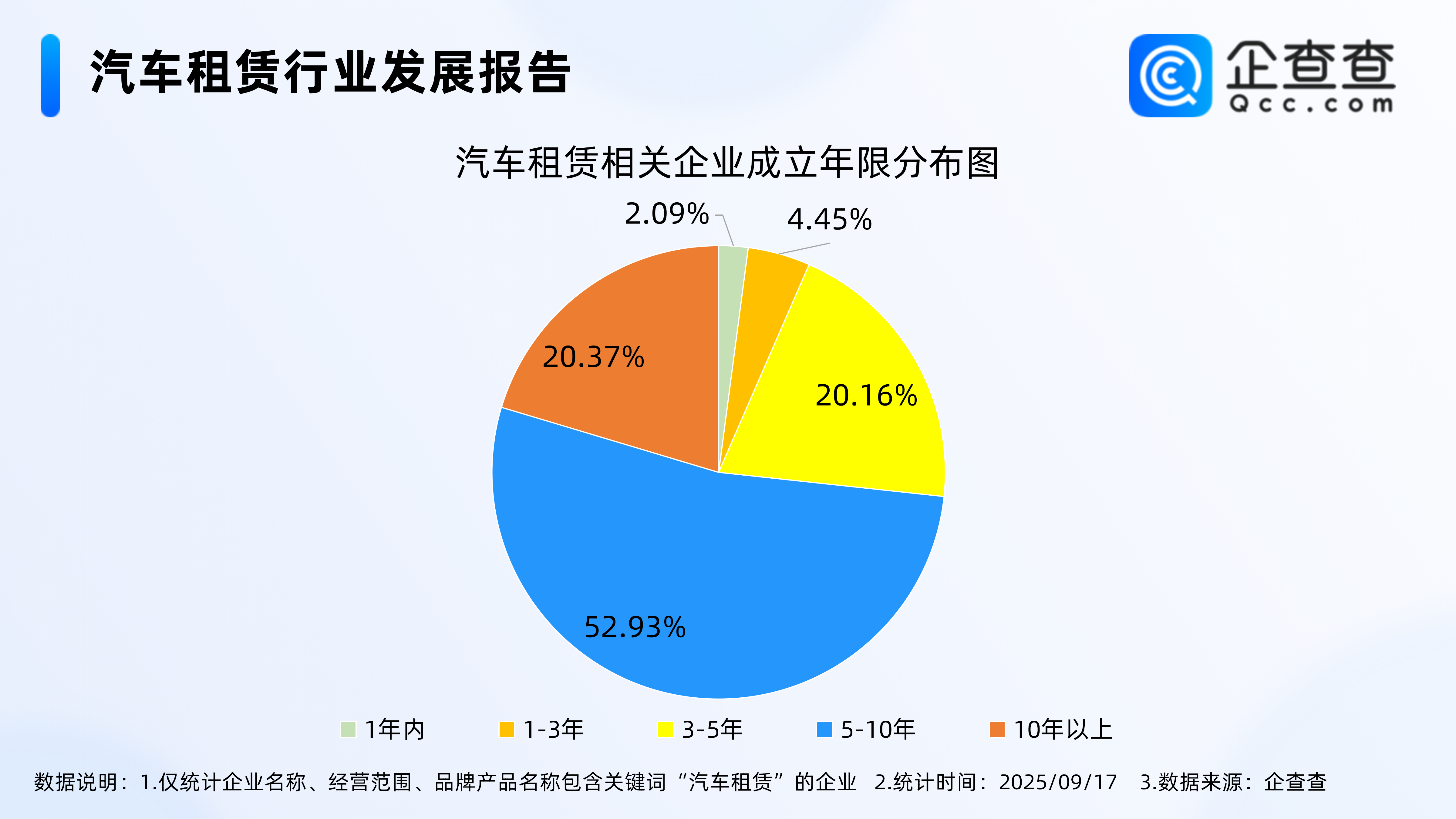 企查查数据显示,国内现存汽车租赁相关企业89.21万家。从经营时间来看,汽车租赁相关企业多为老牌企业,成立年限在5-10年的相关企业过半,占比52.93%。其次,成立年限在10年以上的相关企业占比20.37%。注册量方面,2024年全年注册2.28万家,截至目前,今年已注册1.31万家。