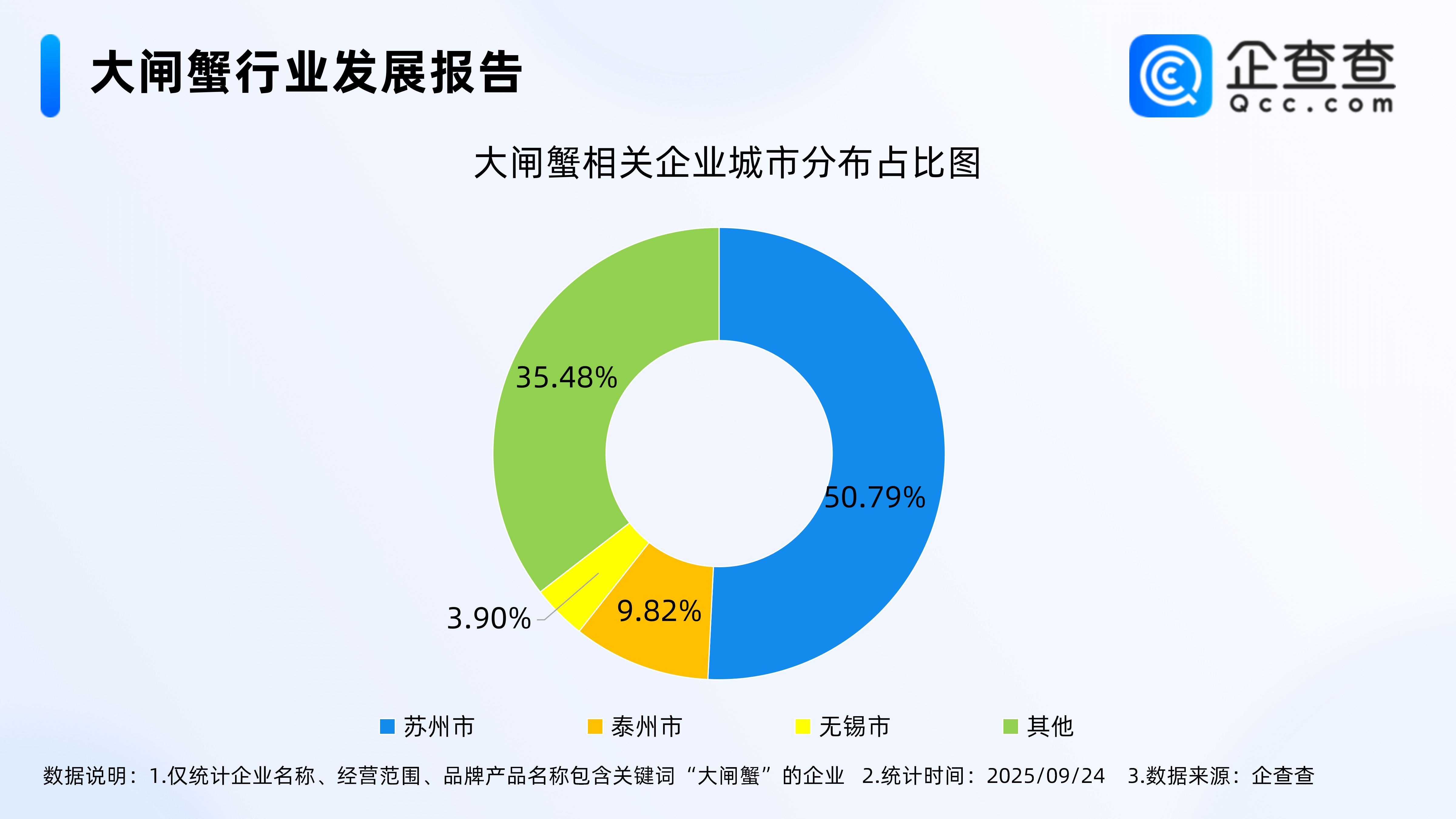 企查查数据显示,从地区来看,大闸蟹相关企业密集分布在华东地区,且以江苏省相关现存企业居多,其中苏州市占全国大闸蟹相关企业存量份额的50.79%,泰州市、无锡市分别占比9.82%、3.90%,紧随其后。