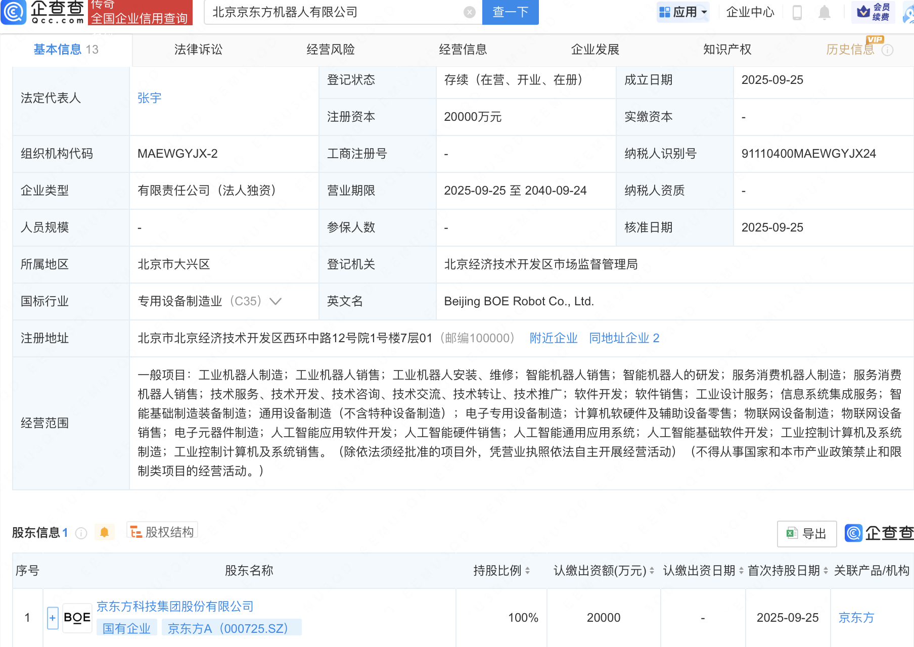 企查查APP显示,近日,北京京东方机器人有限公司成立,注册资本2亿元,经营范围包含:智能机器人销售;智能机器人的研发;人工智能通用应用系统;人工智能基础软件开发等。企查查股权穿透显示,该公司由京东方A(000725)全资持股。