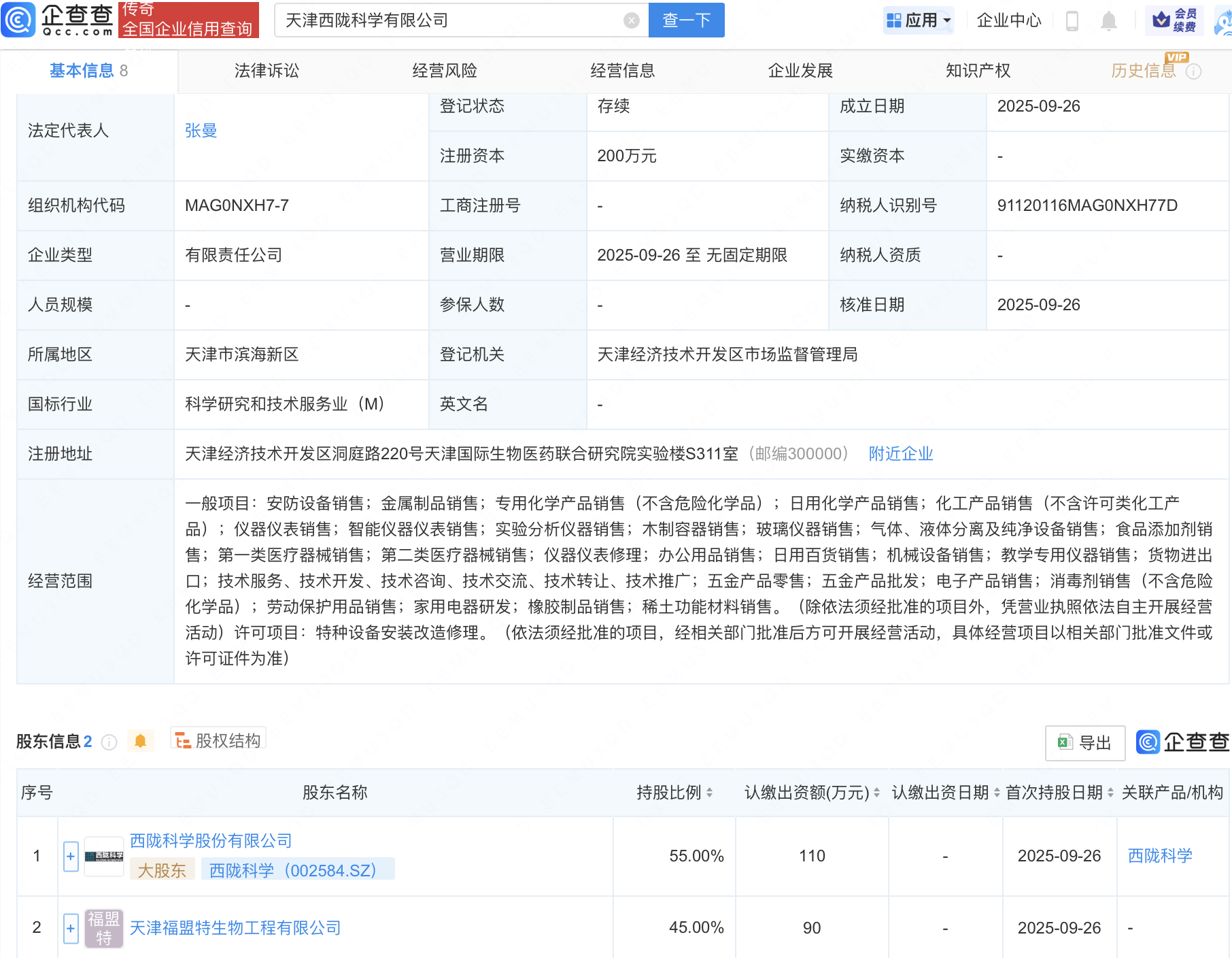 企查查APP显示,近日,天津西陇科学有限公司成立,经营范围包含:劳动保护用品销售;家用电器研发;橡胶制品销售;稀土功能材料销售等。企查查股权穿透显示,该公司由西陇科学(002584)等共同持股。