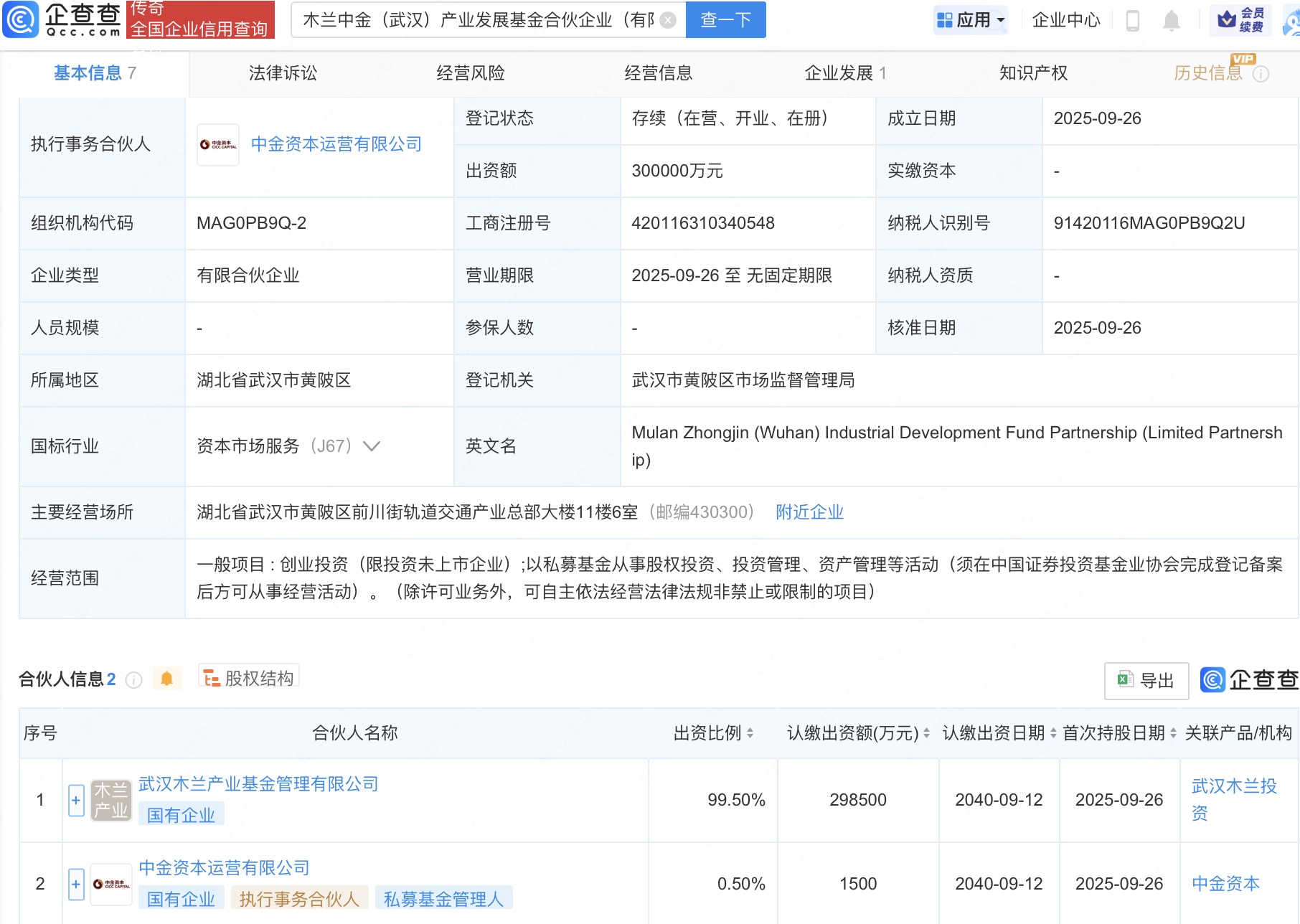 企查查APP显示,近日,木兰中金(武汉)产业发展基金合伙企业(有限合伙)成立,出资额30亿人民币,经营范围为创业投资,以私募基金从事股权投资、投资管理、资产管理等活动。企查查股权穿透显示,该企业由武汉木兰产业基金管理有限公司、中金资本运营有限公司共同出资。