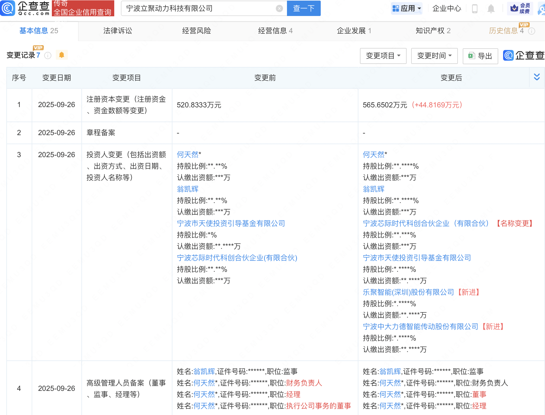 企查查APP显示,近日,宁波立聚动力科技有限公司发生工商变更,新增乐聚机器人关联公司乐聚智能(深圳)股份有限公司、中大力德(002896)为股东,同时注册资本增至565.65万元。企查查信息显示,该公司成立于2024年,法定代表人为何天然,经营范围包含:集成电路芯片设计及服务;汽车零部件研发;智能机器人的研发;人工智能行业应用系统集成服务;人工智能硬件销售等。