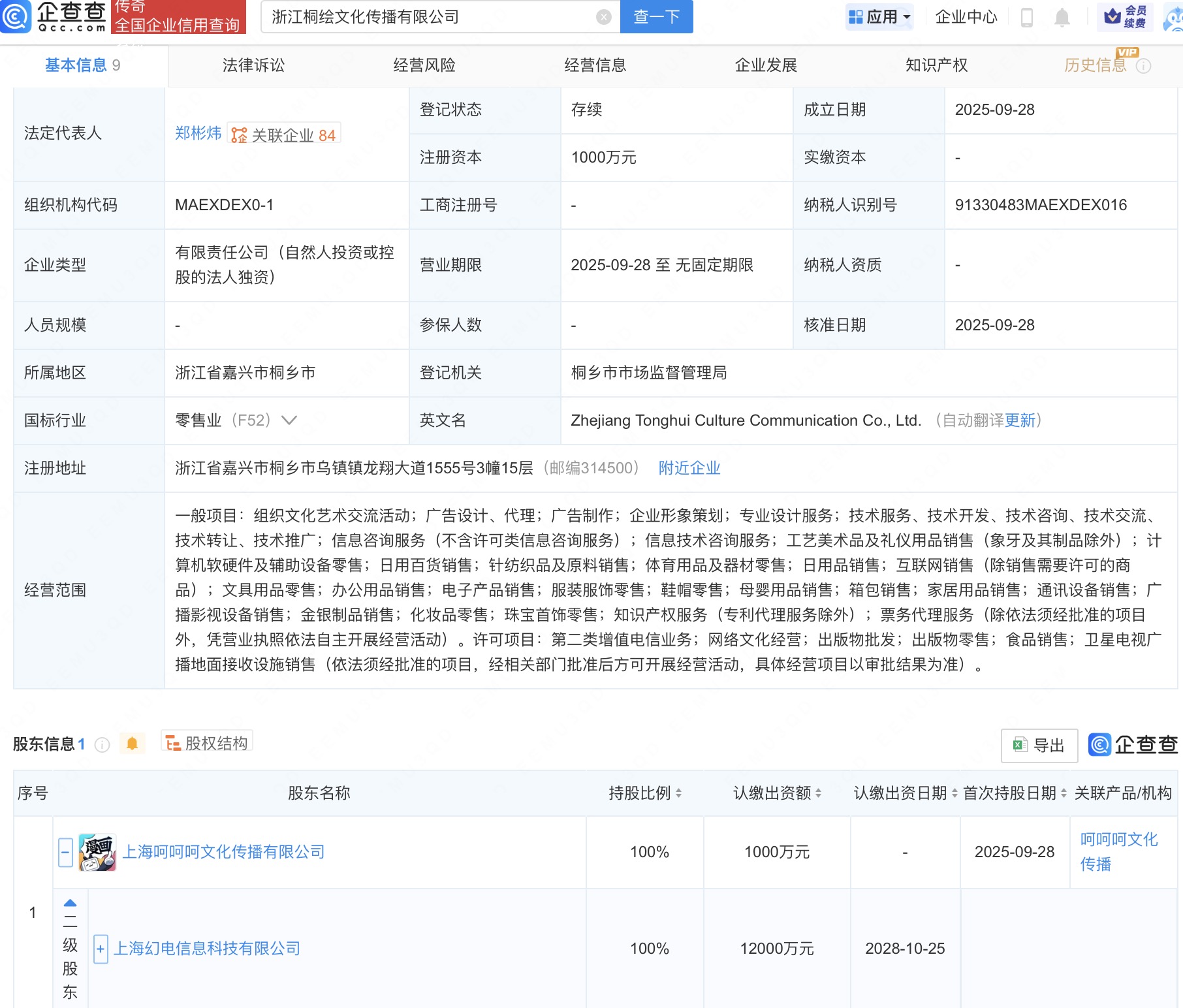 企查查APP显示,近日,浙江桐绘文化传播有限公司成立,法定代表人为郑彬炜,注册资本1000万人民币,经营范围包括组织文化艺术交流活动、广告制作、企业形象策划等。企查查股权穿透显示,该公司由B站关联公司上海幻电信息科技有限公司间接全资持股。