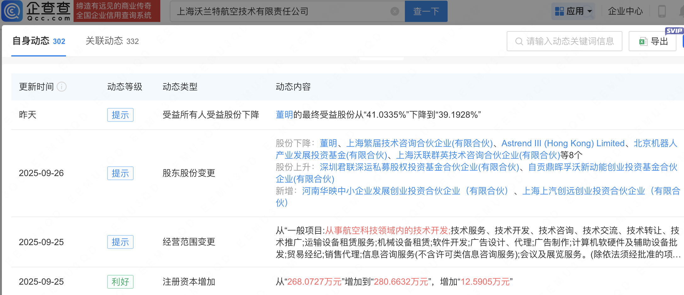 企查查APP显示,近日,上海沃兰特航空技术有限责任公司发生工商变更,新增上汽集团(600104)旗下上海上汽创远创业投资合伙企业(有限合伙)等为股东,同时注册资本增至280.66万元。企查查信息显示,该公司成立于2021年,经营范围包含:民用航空器驾驶员培训;民用航空器维修;民用航空器(发动机、螺旋桨)生产等。据其官网,沃兰特从事电动垂直起降飞行器研制。