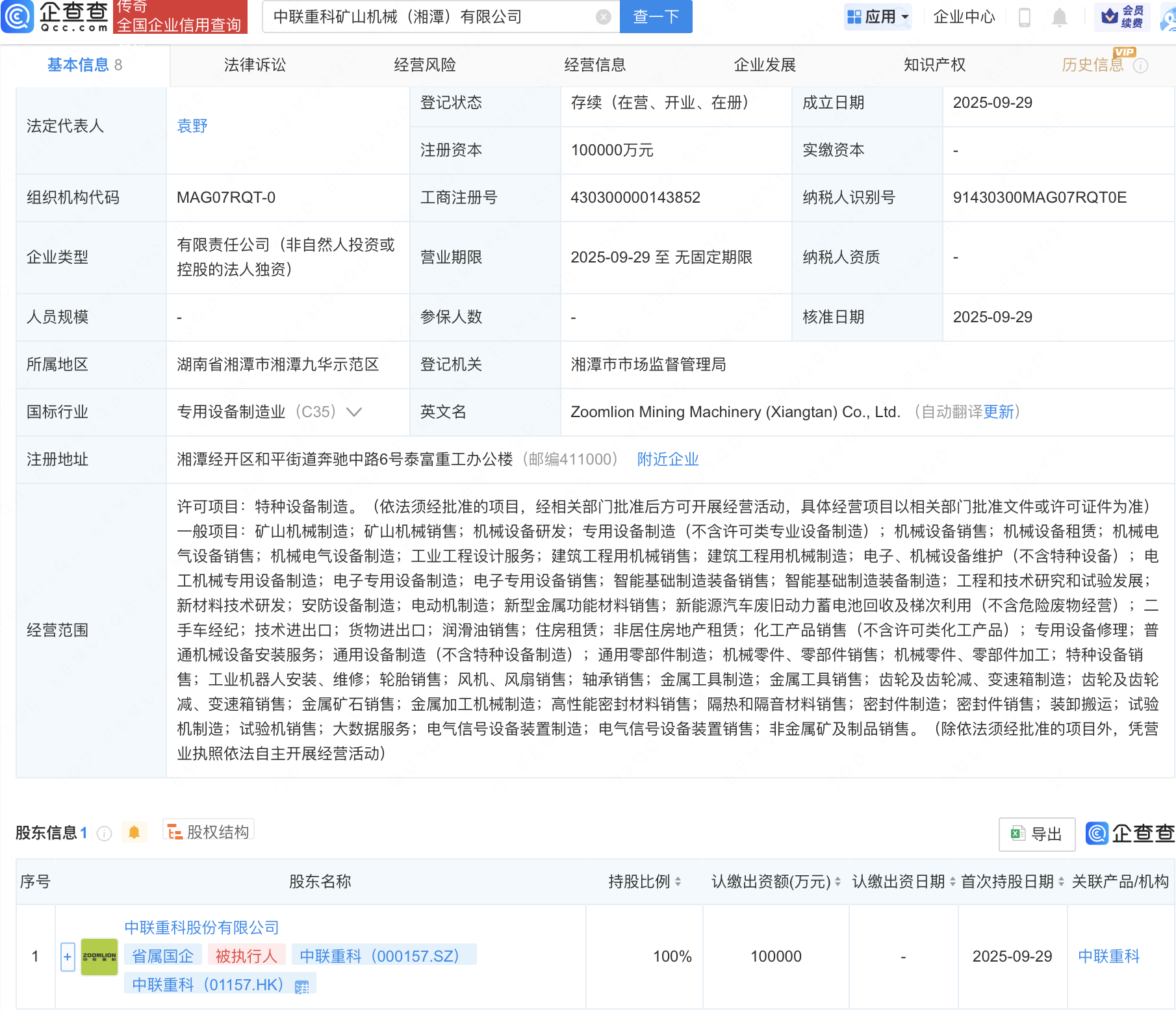 企查查APP显示,近日,中联重科矿山机械(湘潭)有限公司成立,注册资本10亿元,经营范围包含:智能基础制造装备制造;电子专用设备制造;二手车经纪;工业机器人安装、维修等。企查查股权穿透显示,该公司由中联重科(000157)全资持股。