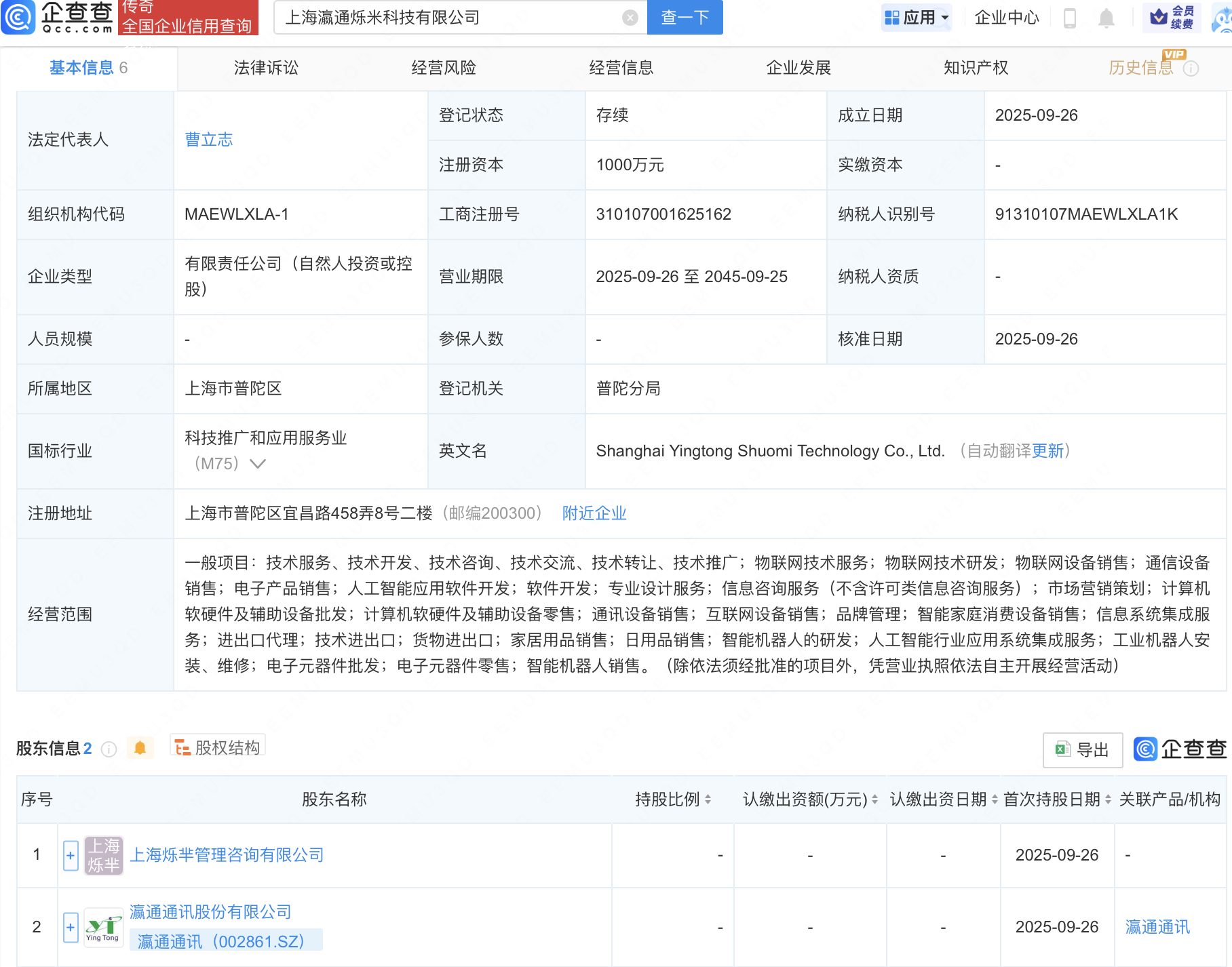 企查查APP显示,近日,上海瀛通烁米科技有限公司成立,注册资本1000万元,经营范围包含:物联网技术服务;物联网技术研发;人工智能应用软件开发;人工智能行业应用系统集成服务;智能机器人的研发等。企查查股权穿透显示,该公司由瀛通通讯(002861)等共同持股。