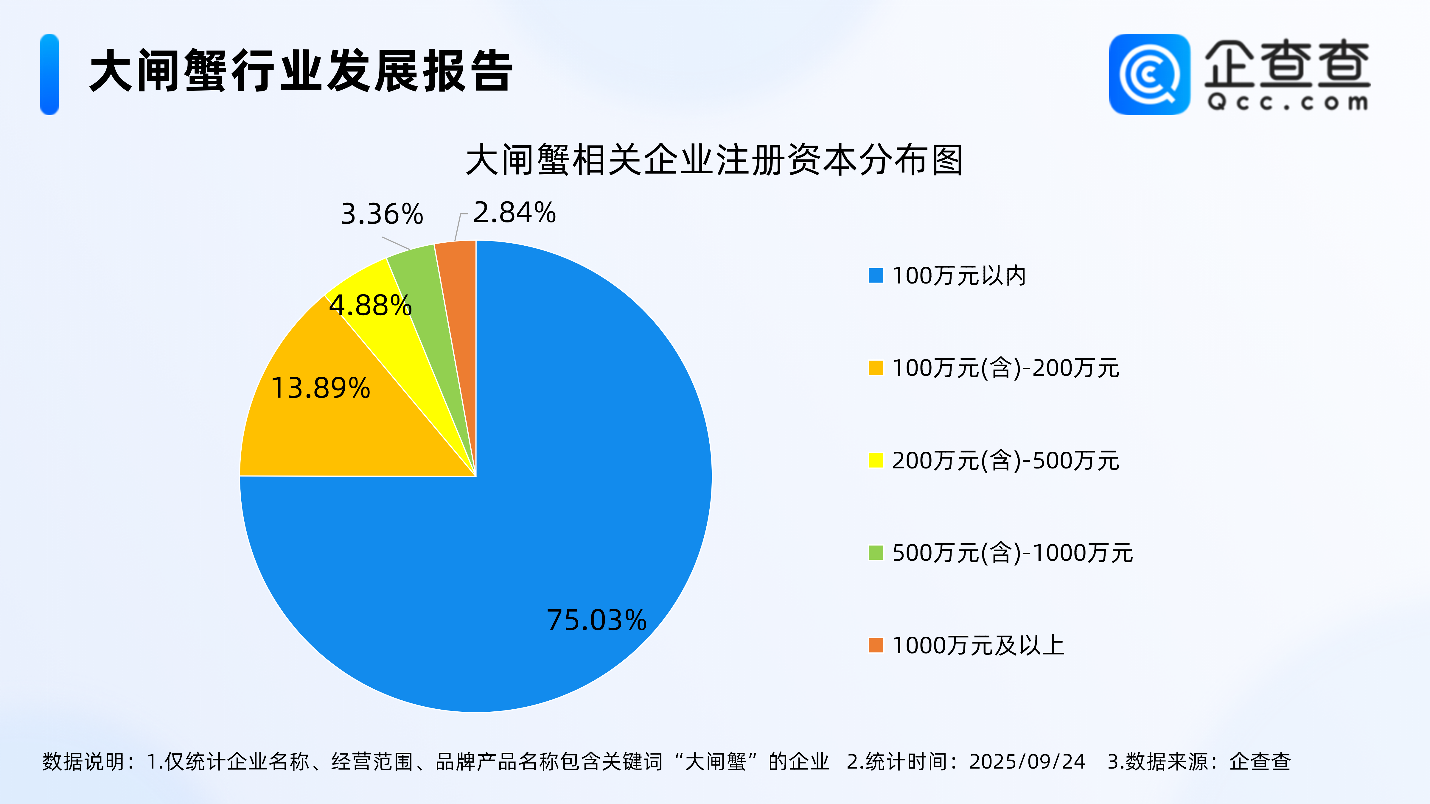 企查查数据显示,从注册资本来看,大闸蟹相关企业注册资本多为轻量级,注册资本在100万元以内的相关企业最多,占比75.03%。其次,注册资本在100万元(含)-200万元的相关企业占比13.89%。