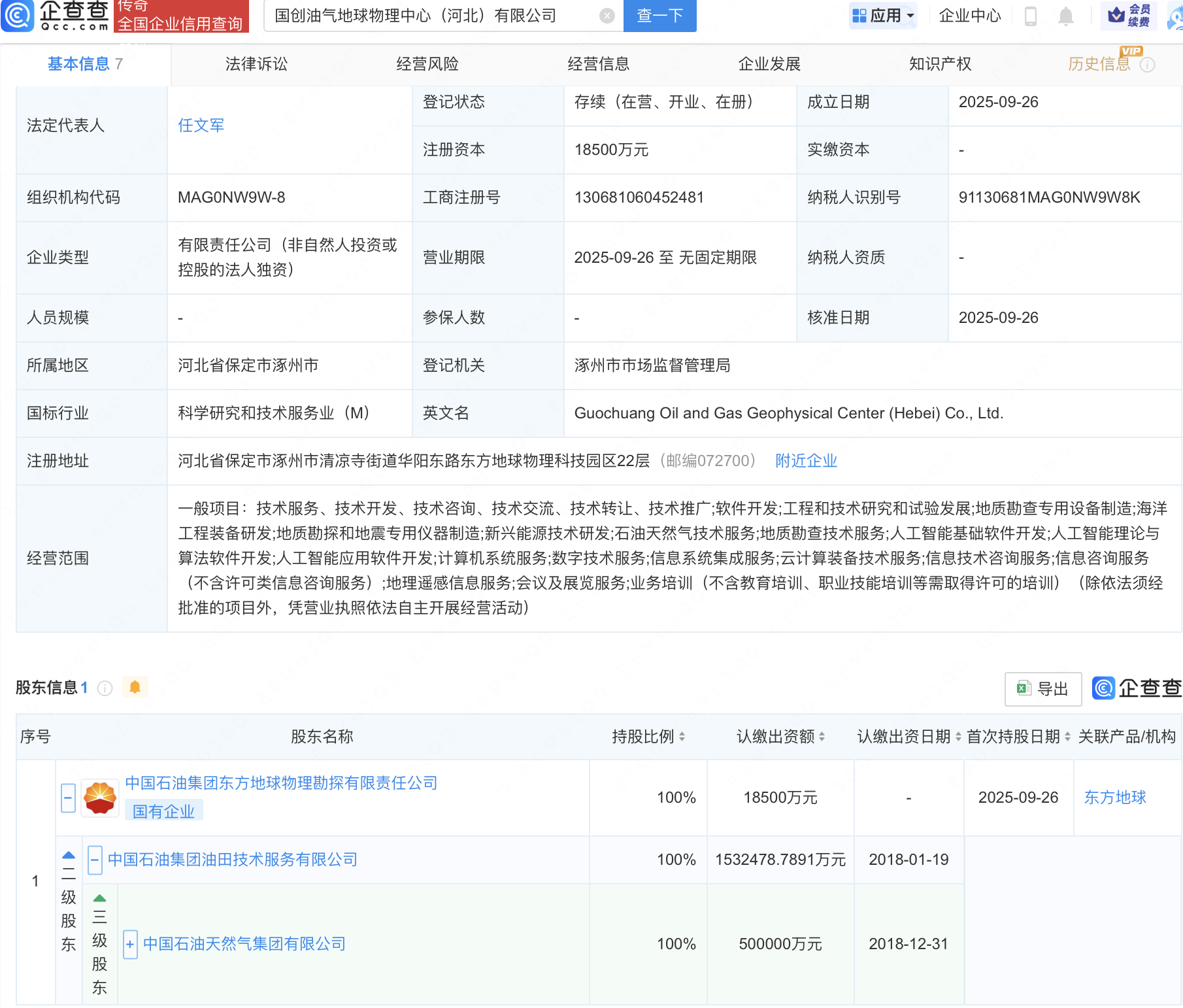 企查查APP显示,近日,国创油气地球物理中心(河北)有限公司成立,注册资本1.85亿元,经营范围包含:地质勘查技术服务;人工智能基础软件开发;人工智能理论与算法软件开发;人工智能应用软件开发等。企查查股权穿透显示,该公司由中国石油天然气集团有限公司间接全资持股。