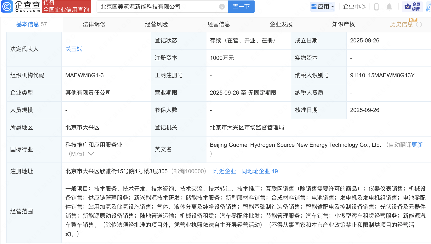 企查查APP显示,近日,北京国美氢源新能科技有限公司成立,注册资本1000万元,经营范围包含:储能技术服务;新型膜材料销售;汽车销售;小微型客车租赁经营服务;新能源汽车整车销售等。企查查股权穿透显示,该公司由北京国美氢能科技有限公司、黄俊烈(即黄光裕)名下北京鹏润投资有限公司共同持股。