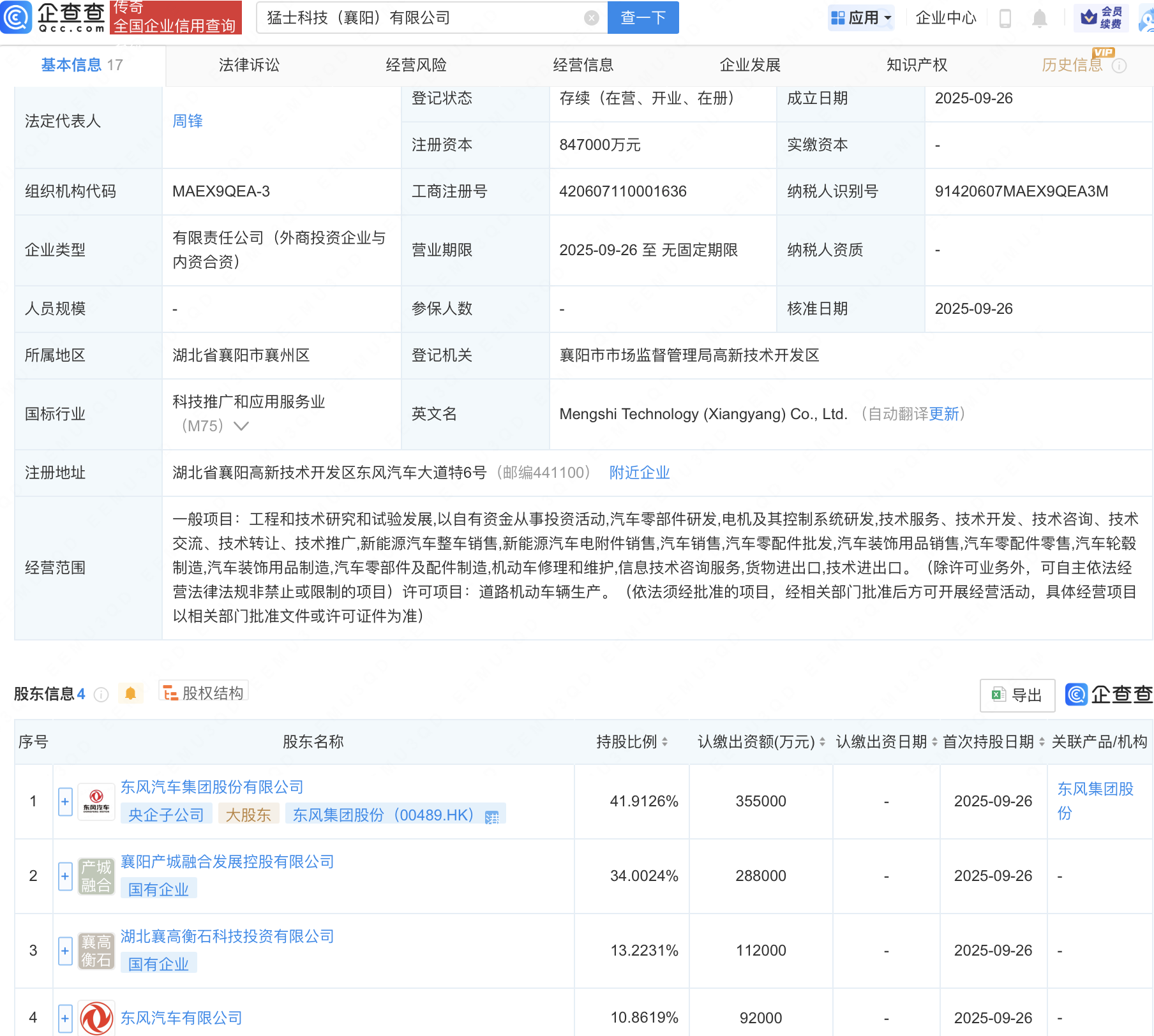 企查查APP显示,近日,猛士科技(襄阳)有限公司成立,注册资本84.7亿元,经营范围包含:工程和技术研究和试验发展;以自有资金从事投资活动;汽车零部件研发;电机及其控制系统研发等。企查查股权穿透显示,该公司由东风集团股份(00489.HK)、东风汽车有限公司等共同持股。