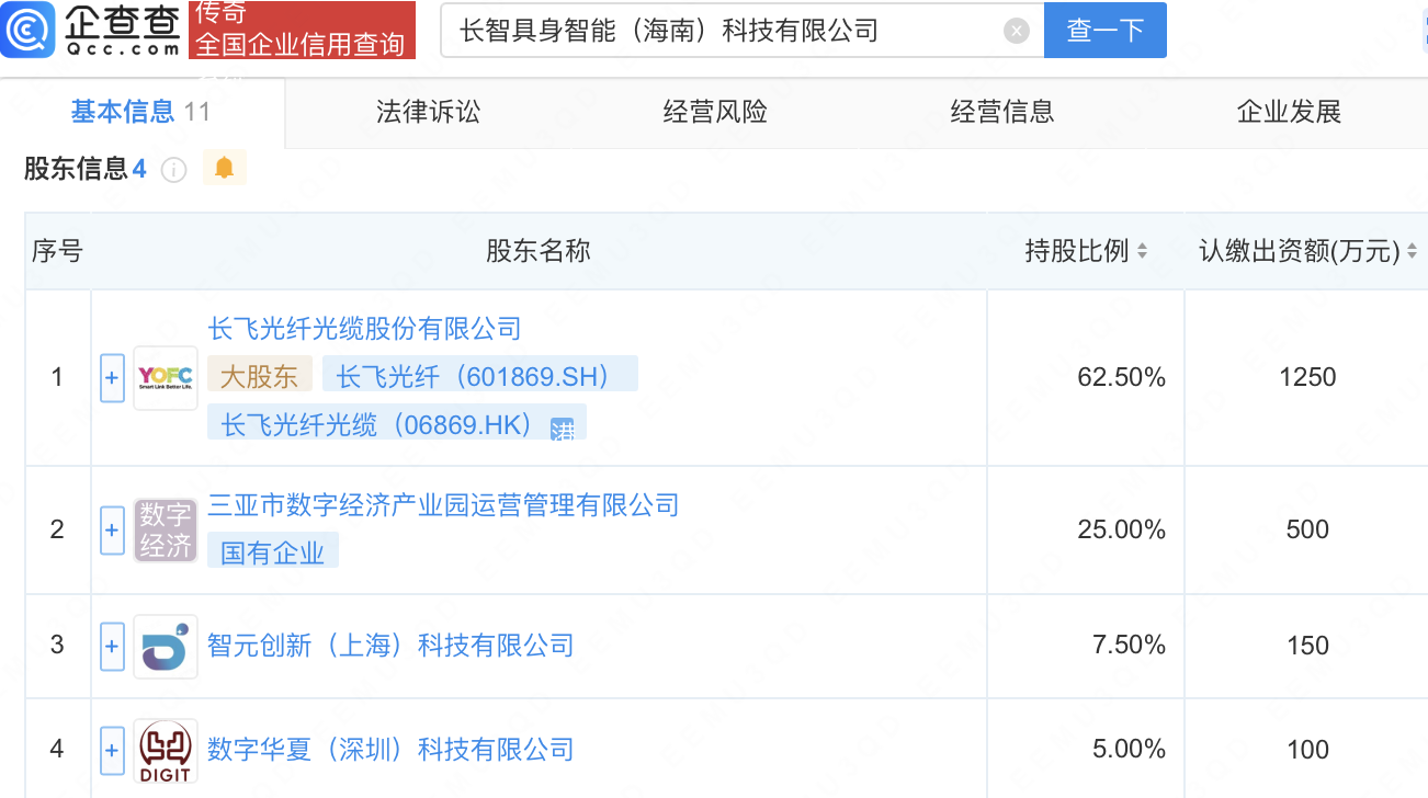 企查查APP显示,近日,长智具身智能(海南)科技有限公司成立,注册资本2000万元,经营范围包含:人工智能应用软件开发;人工智能基础软件开发;数字文化创意软件开发;智能机器人的研发;智能机器人销售等。企查查股权穿透显示,该公司由智元机器人关联公司智元创新(上海)科技有限公司、长飞光纤(601869)等共同持股。