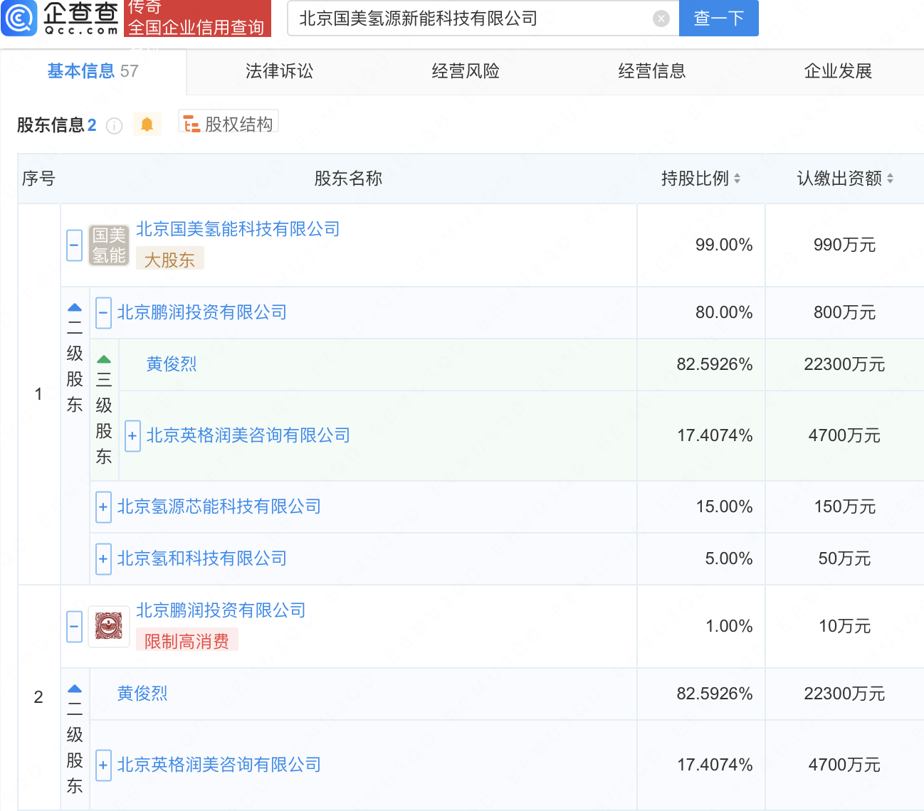 企查查APP显示,近日,北京国美氢源新能科技有限公司成立,注册资本1000万元,经营范围包含:储能技术服务;新型膜材料销售;汽车销售;小微型客车租赁经营服务;新能源汽车整车销售等。企查查股权穿透显示,该公司由北京国美氢能科技有限公司、黄俊烈(即黄光裕)名下北京鹏润投资有限公司共同持股。