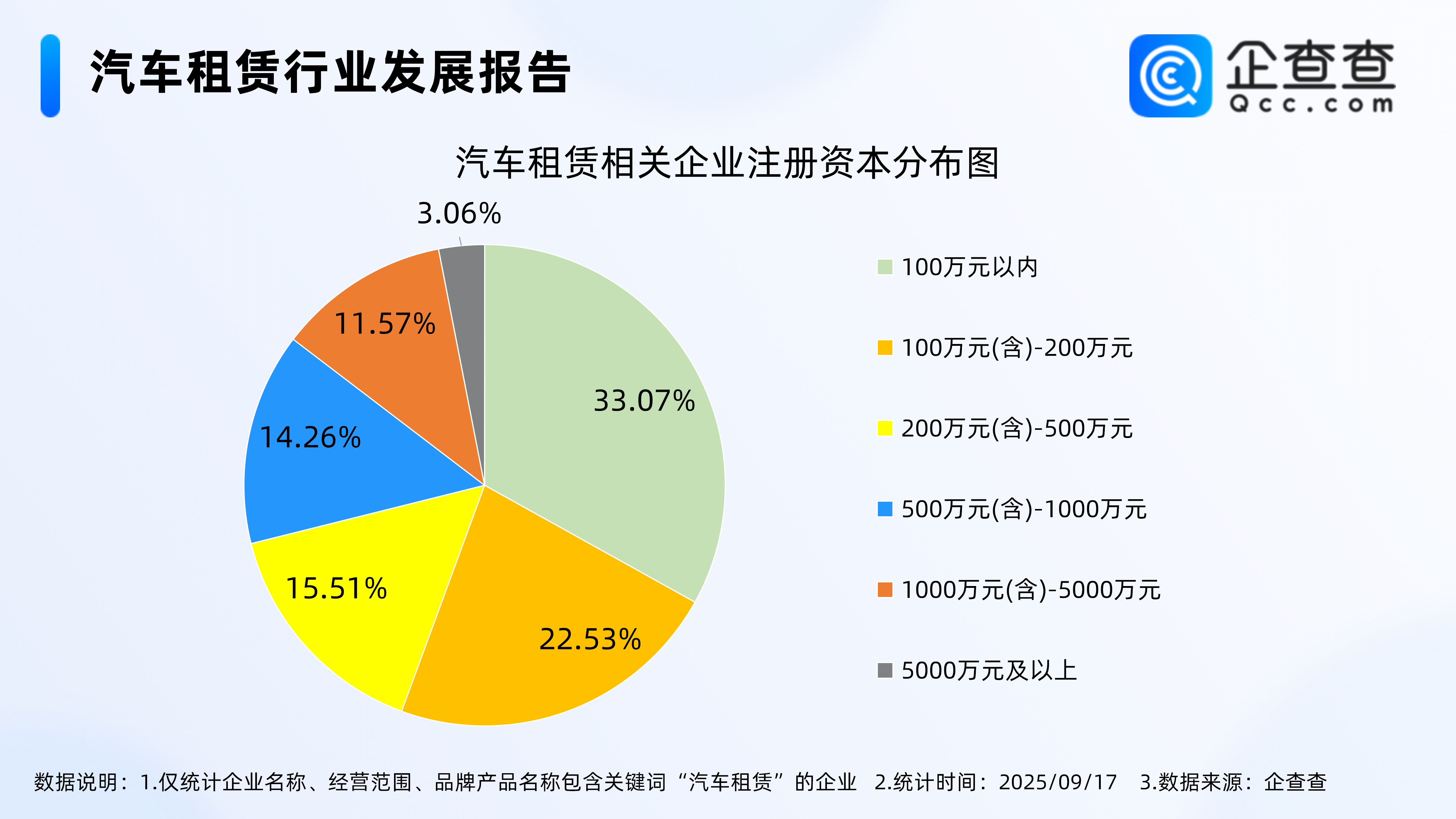企查查数据显示,从注册资本来看,汽车租赁相关企业多为轻量级企业,注册资本在100万元以内的相关企业最多,占比33.07%。其次,注册资本在100万元(含)-200万元的相关企业占比22.53%。
