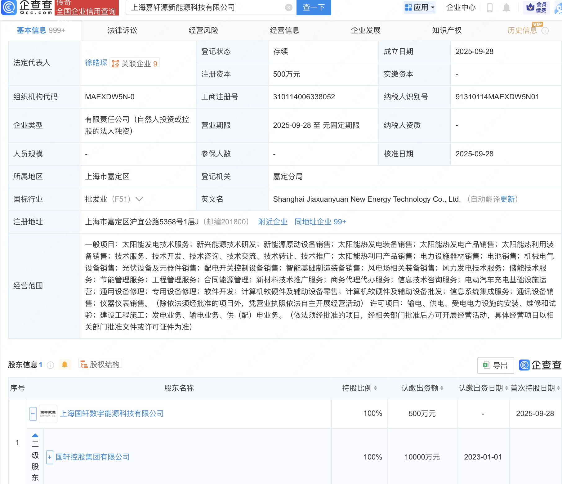 企查查APP显示,近日,上海嘉轩源新能源科技有限公司成立,法定代表人为徐皓琛,经营范围含太阳能发电技术服务、新兴能源技术研发、新能源原动设备销售、太阳能热发电装备销售等。企查查股权穿透显示,该公司由国轩控股集团有限公司间接全资持股。