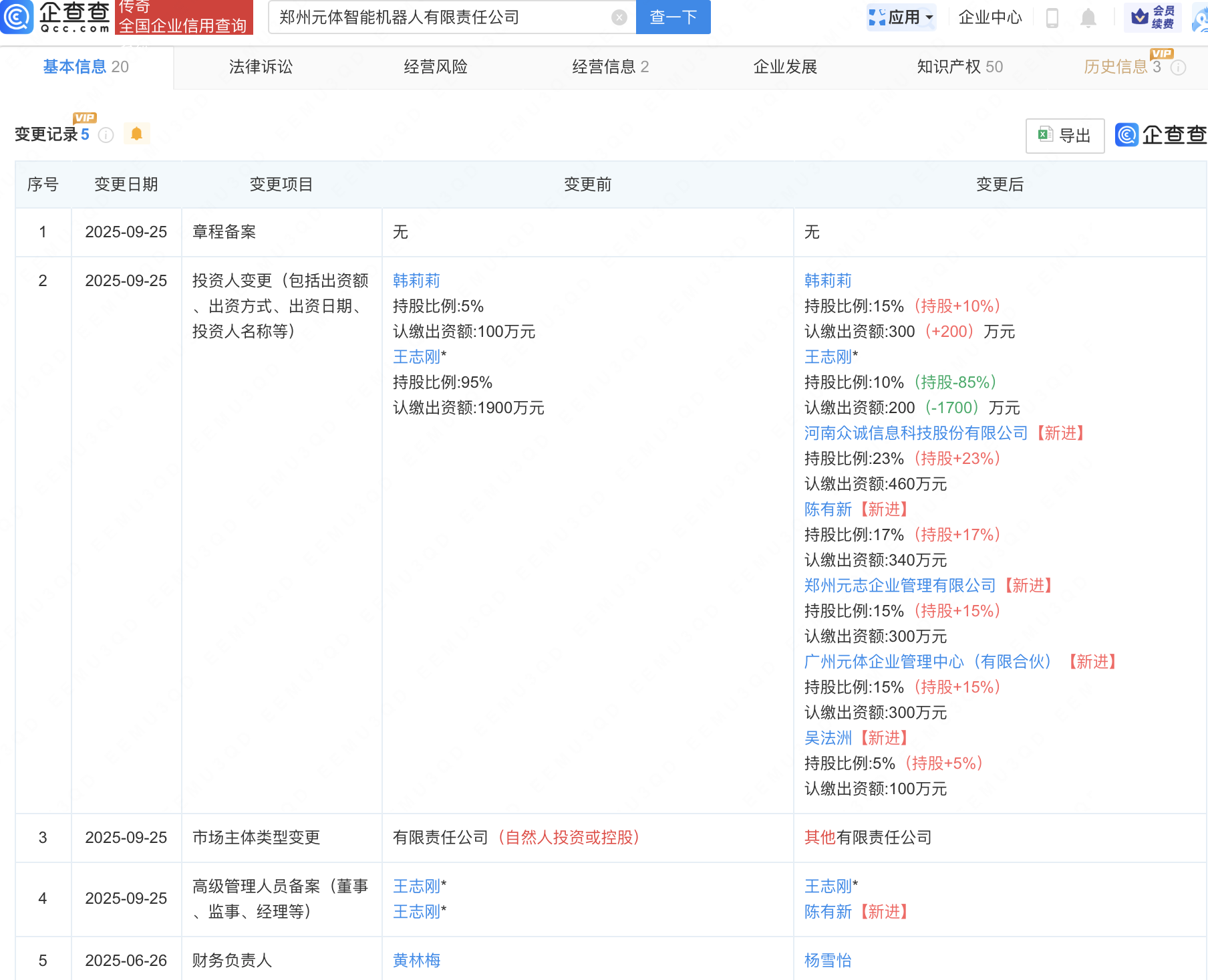 企查查APP显示,近日,郑州元体智能机器人有限责任公司发生工商变更,新增众诚科技(835207)为大股东,持股23%。企查查信息显示,该公司成立于2025年3月,注册资本2000万元,经营范围包含:智能机器人的研发;智能机器人销售;人工智能硬件销售;人工智能基础软件开发;集成电路设计等。