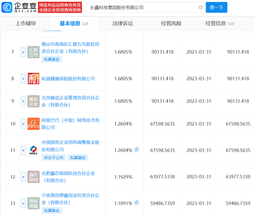 长鑫科技IPO辅导完成:企查查显示其融资6轮,阿里巴巴是股东
