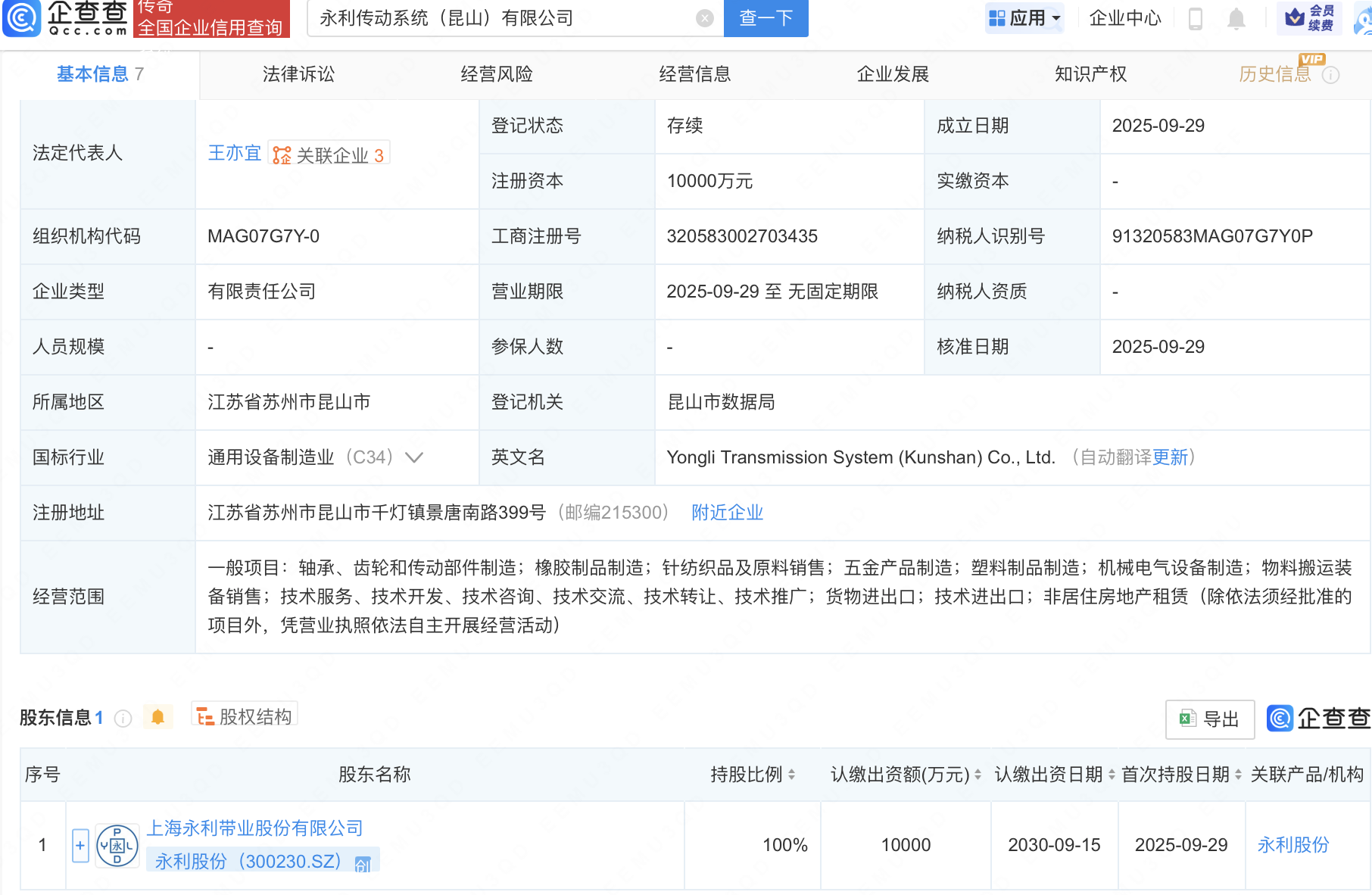 企查查APP显示,近日,永利传动系统(昆山)有限公司成立,注册资本1亿元,经营范围包含:轴承、齿轮和传动部件制造;橡胶制品制造;针纺织品及原料销售;五金产品制造等。企查查股权穿透显示,该公司由永利股份(300230)全资持股。