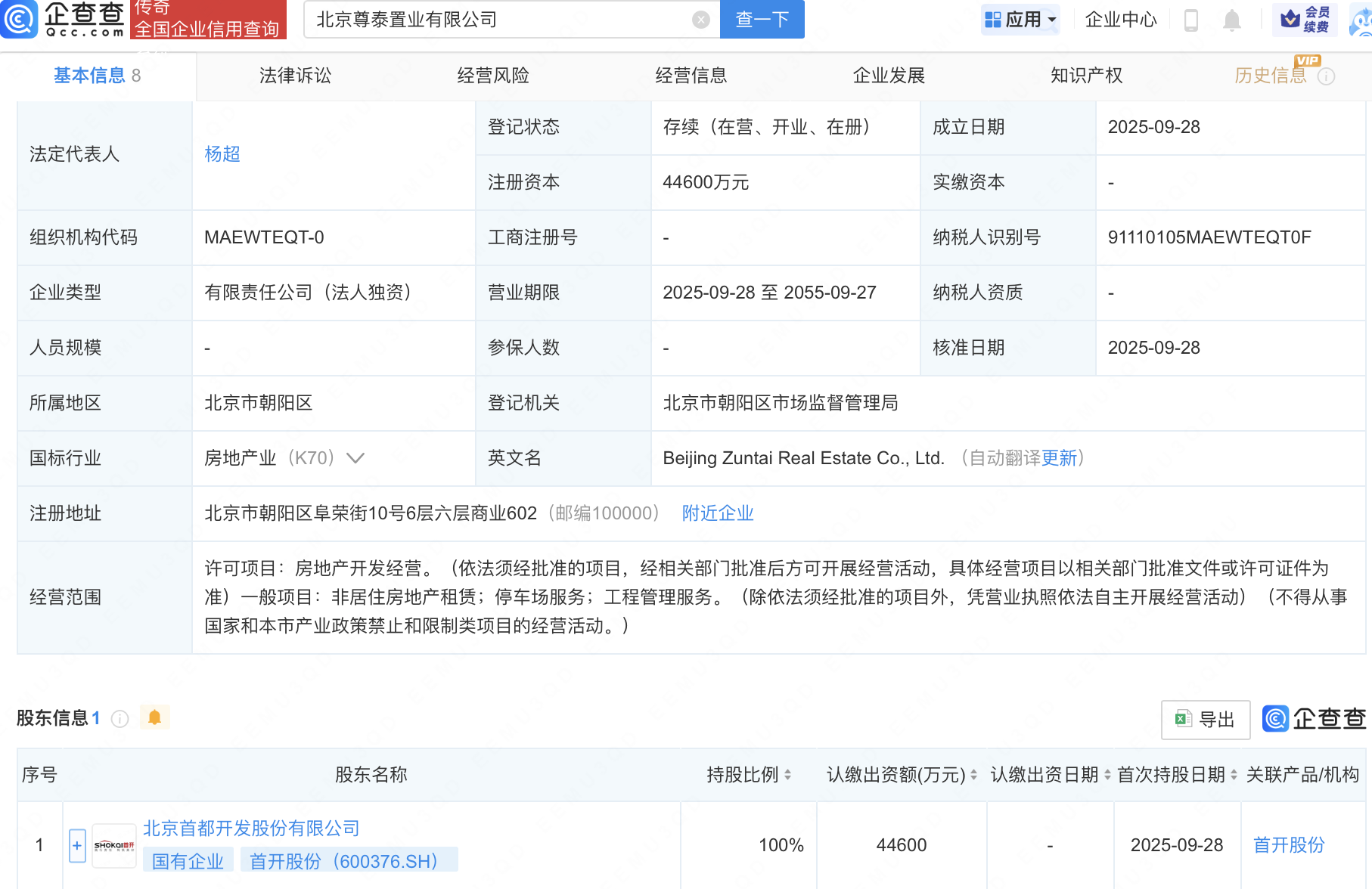 企查查APP显示,近日,北京尊泰置业有限公司成立,注册资本4.46亿元,经营范围包含:房地产开发经营;非居住房地产租赁;停车场服务;工程管理服务。企查查股权穿透显示,该公司由首开股份(600376)全资持股。