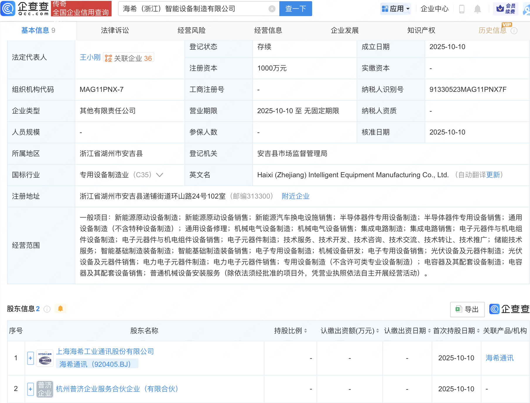企查查APP显示,近日,海希(浙江)智能设备制造有限公司成立,注册资本1000万元,经营范围包含:半导体器件专用设备制造;半导体器件专用设备销售;集成电路制造;集成电路销售等。企查查股权穿透显示,该公司由海希通讯(920405)等共同持股。