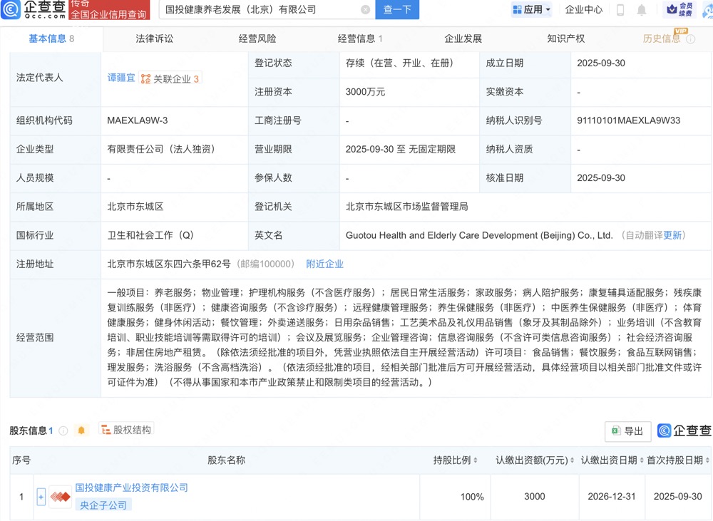 企查查APP显示,近日,国投健康养老发展(北京)有限公司成立,法定代表人为谭疆宜,注册资本3000万人民币,经营范围包括养老服务、物业管理、护理机构服务等。企查查股权穿透显示,该公司由国投健康产业投资有限公司全资持股。