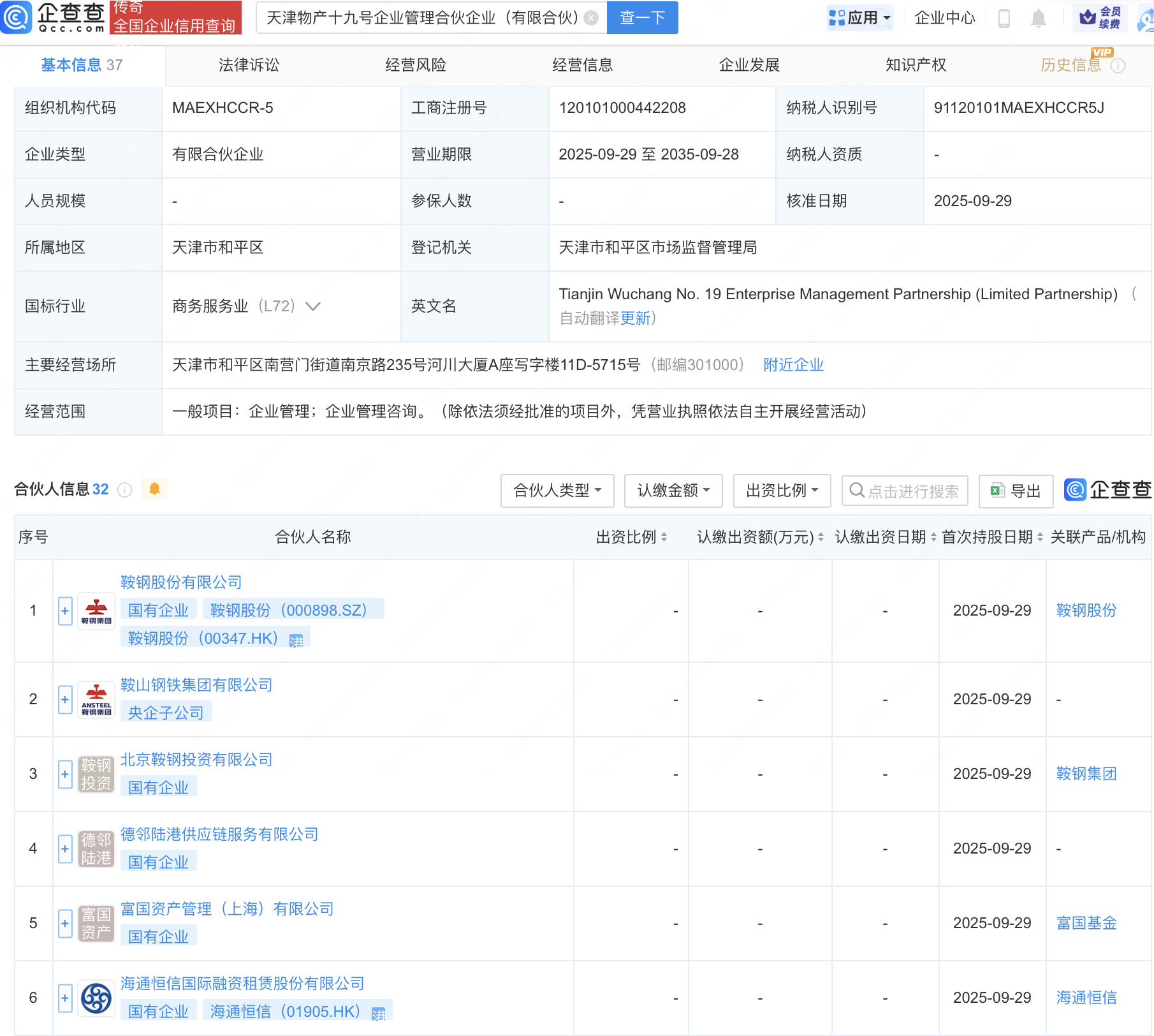 企查查APP显示,近日,天津物产十九号企业管理合伙企业(有限合伙)成立,经营范围包含:企业管理;企业管理咨询。企查查股权穿透显示,该企业由鞍钢股份(000898)、海通恒信(01905.HK)等共同出资。