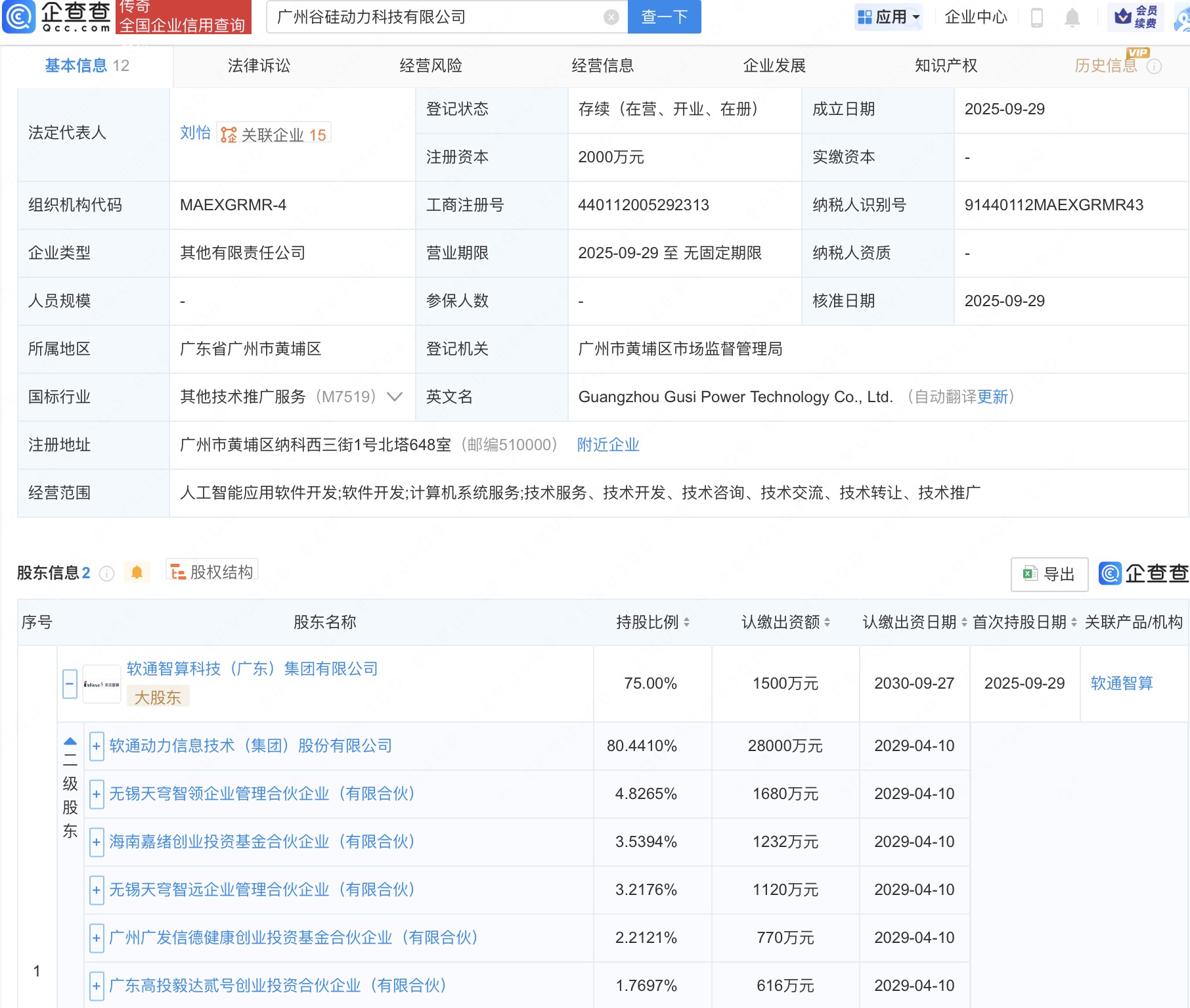 企查查APP显示,近日,广州谷硅动力科技有限公司成立,法定代表人为刘怡,注册资本2000万人民币,经营范围包括人工智能应用软件开发、软件开发、计算机系统服务等。企查查股权穿透显示,该公司由软通动力(301236)旗下软通智算科技(广东)集团有限公司等共同持股。