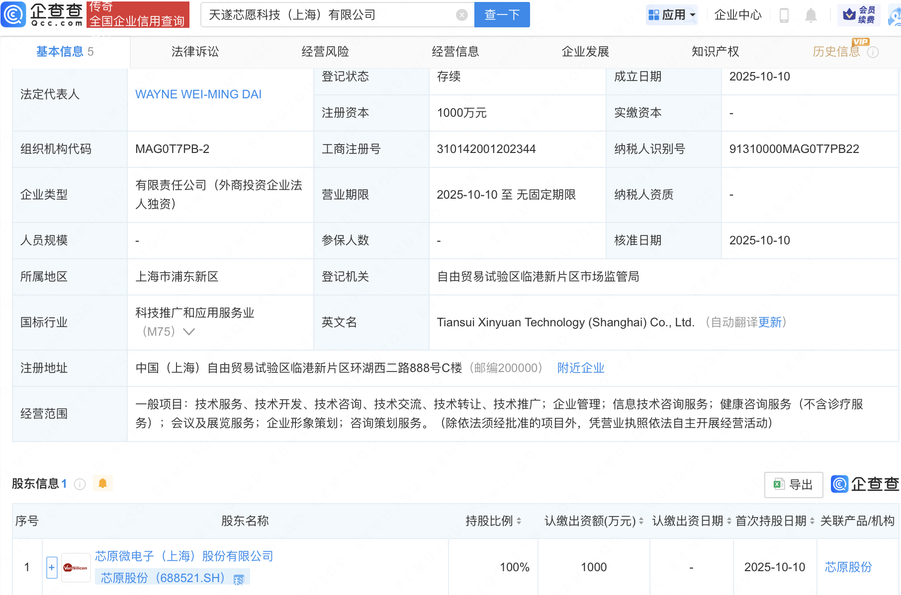 企查查APP显示,近日,天遂芯愿科技(上海)有限公司成立,注册资本1000万元,经营范围包含:企业管理;信息技术咨询服务;健康咨询服务(不含诊疗服务);会议及展览服务等。企查查股权穿透显示,该公司由芯原股份(688521)全资持股。