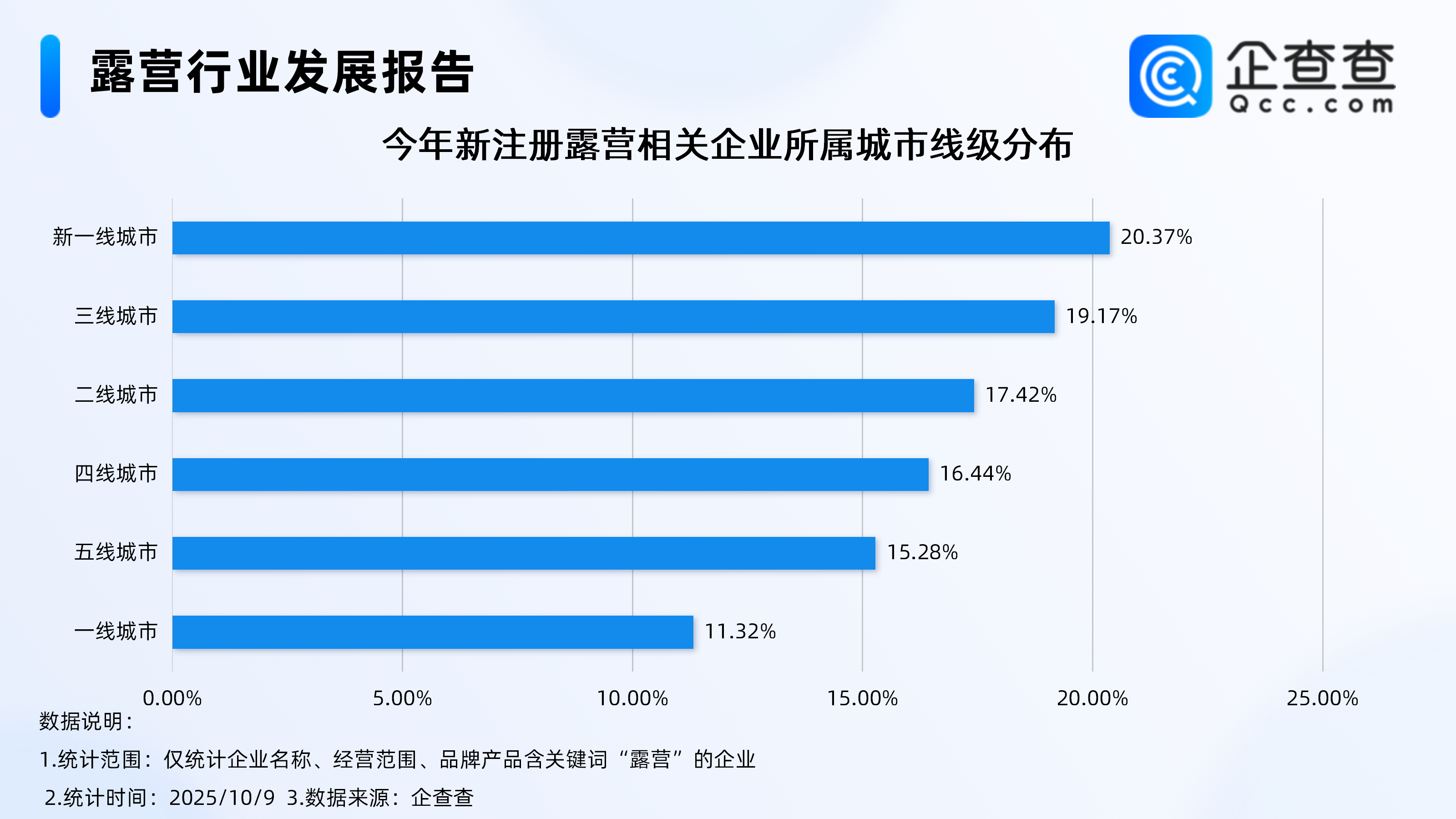 企查查数据显示,注册量方面,今年前9月露营相关企业注册量达5.17万家,与去年同期相比略增。今年以来新注册的露营相关企业多集中在新一线城市、三线城市,分别占比20.37%、19.17%。