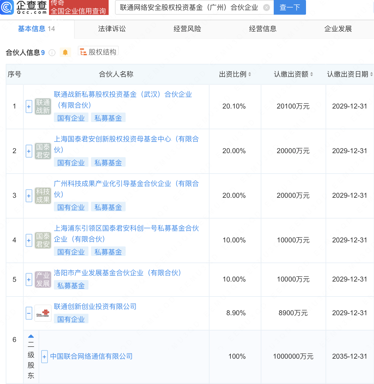 企查查APP显示,近日,联通网络安全股权投资基金(广州)合伙企业(有限合伙)成立,出资额10亿元,经营范围包含:以自有资金从事投资活动。企查查股权穿透显示,该企业由中国联合网络通信有限公司全资子公司联通创新创业投资有限公司等共同出资。