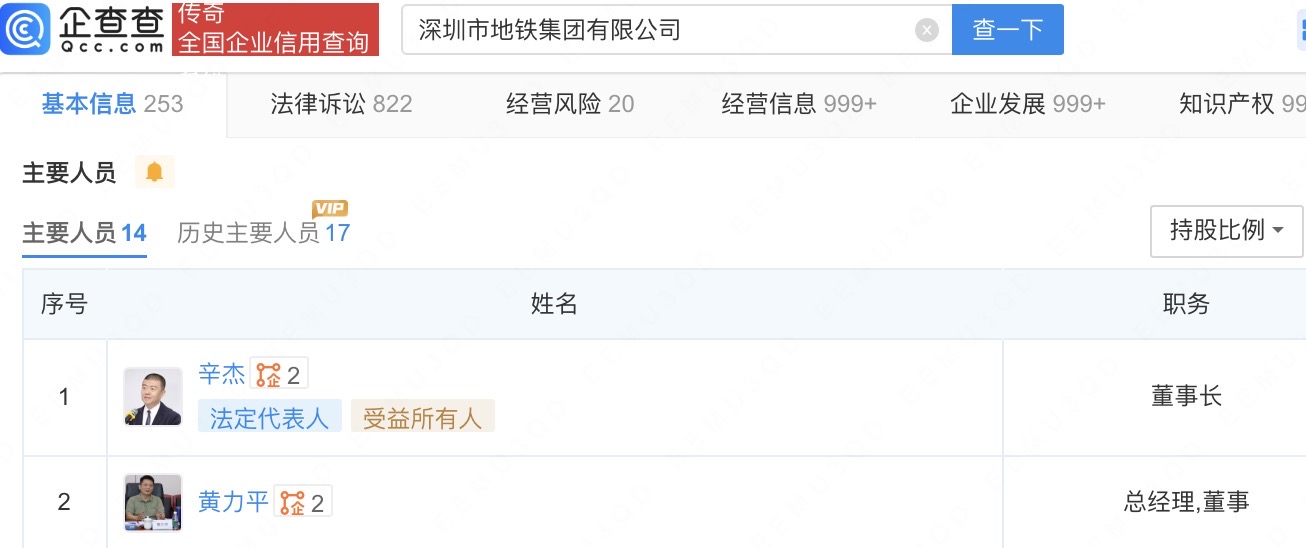 企查查APP显示,目前,辛杰名下关联2家企业,分别为深圳市地铁集团有限公司、万科企业股份有限公司。值得注意的是,辛杰为深圳市地铁集团有限公司法定代表人 、董事长,黄力平为深圳市地铁集团有限公司董事、总经理。