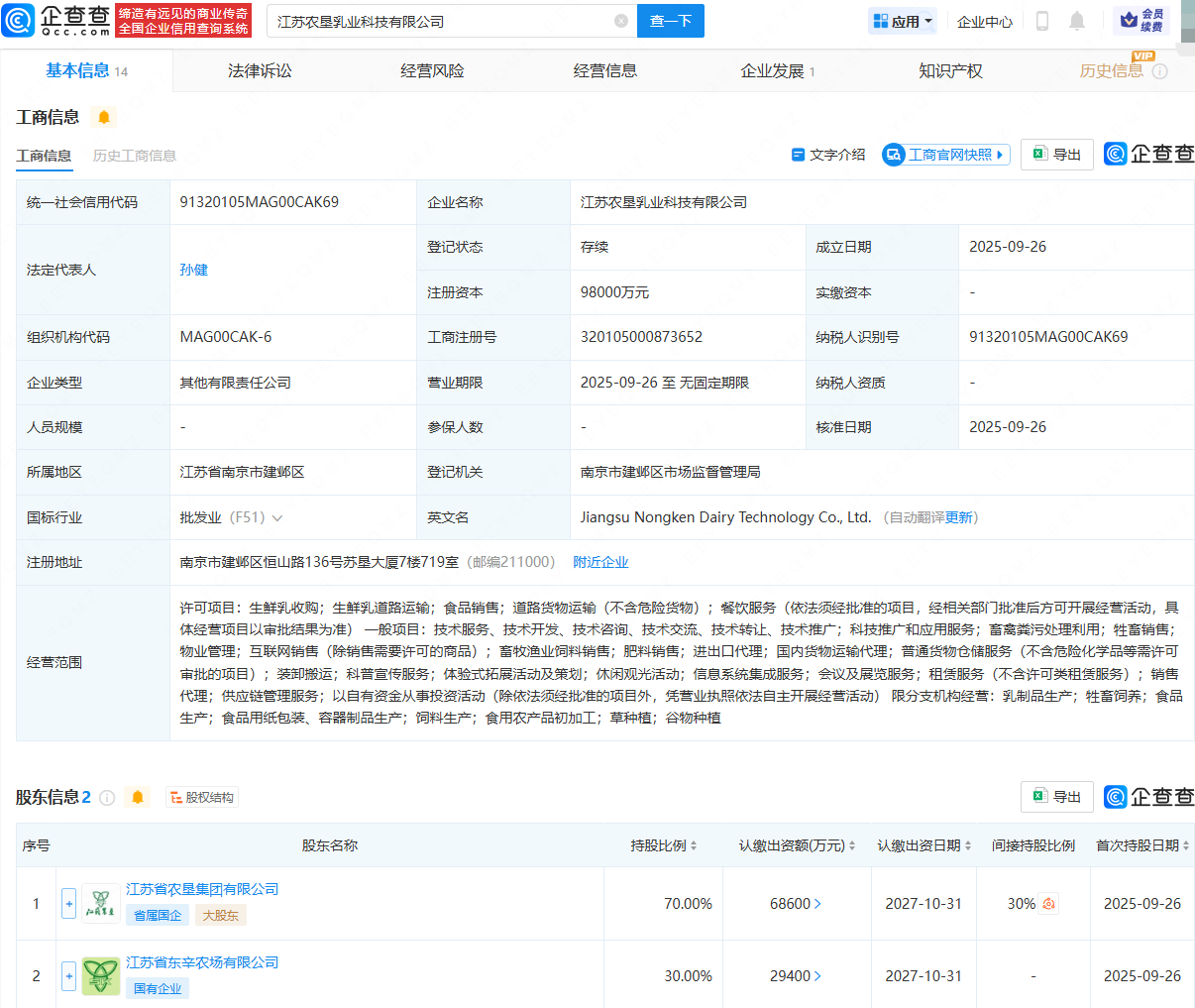 企查查APP显示,近日,江苏农垦乳业科技有限公司成立,法定代表人为孙健,注册资本为9.8亿元,经营范围包含:生鲜乳收购;生鲜乳道路运输;食品销售;牲畜销售;物业管理;乳制品生产;牲畜饲养;食品生产等。企查查股权穿透显示,该公司由江苏省农垦集团有限公司、江苏省东辛农场有限公司共同持股。